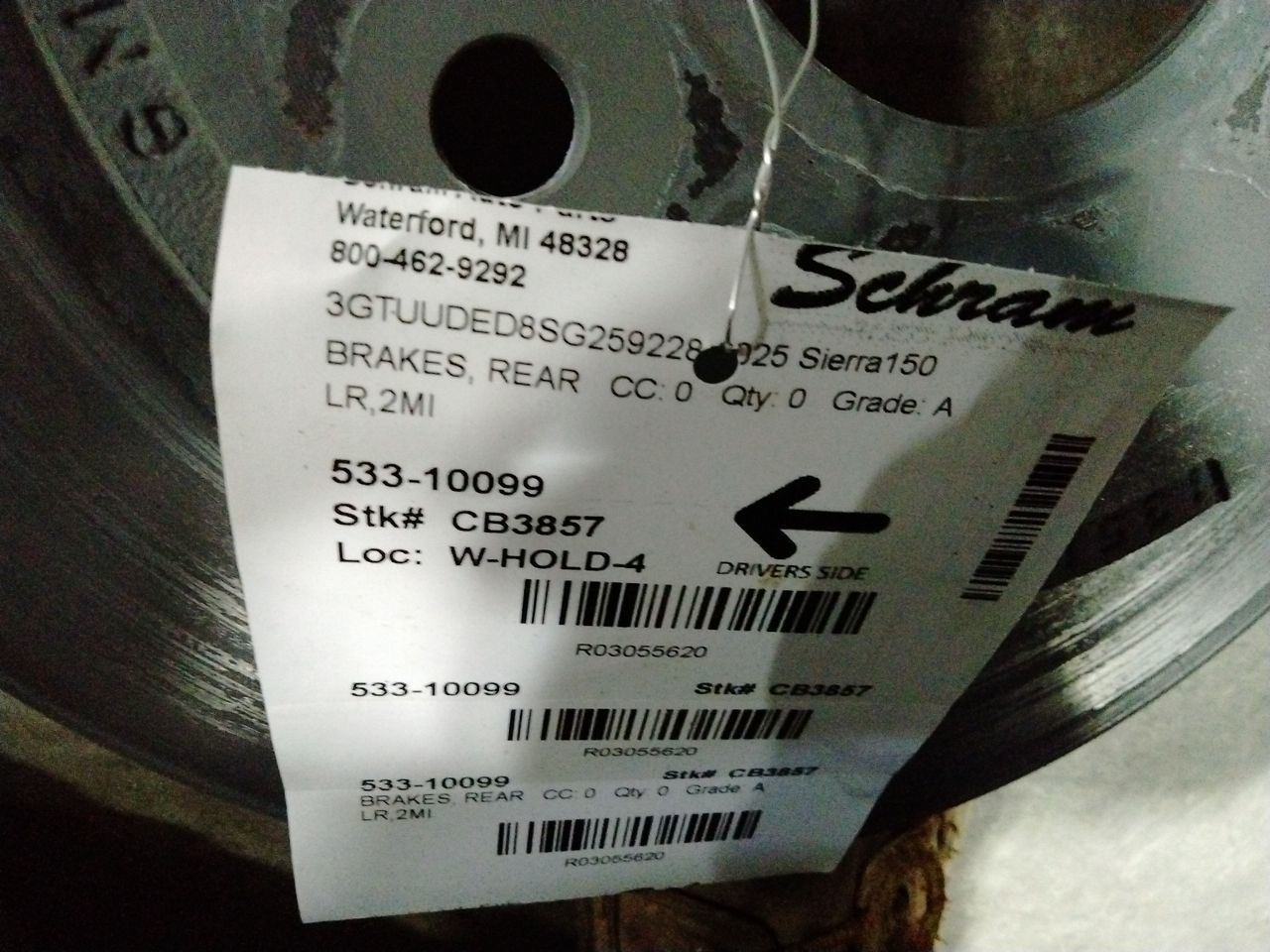 1923   Description LR,2MI Mileage: 0 This item will fit the following vehicles/applications: ESCALADE 21-23 ESCALADE ESV 21-22 SIERRA 1500 PICKUP 19 new style (mirrors mount on door skin) SIERRA 1500 PICKUP 20-25 SIERRA DENALI 1500 19-24 SILVERADO 1500 PICKUP 19 new style (mirrors mount on door skin) SILVERADO 1500 PICKUP 20-22 SILVERADO 1500 PICKUP 23-25 w/o police package SUBURBAN 1500 21-24 TAHOE 21-25 w/o heavy duty brakes YUKON 21-24 YUKON XL 1500 21-23 **OEM Rear Rotor or Drum – Reliable Braking Performance** **Schram Auto and Truck Parts - Rear Rotor/Drum** Restore your vehicle’s braking power with a quality **Rear Rotor or Drum** from Schram Auto Parts. This used OEM component has been professionally removed, inspected, and verified to be in sound working order unless otherwise noted. **Fitment Verification Required** Please confirm compatibility using the part number, description, and any vehicle fitment data shown in this listing. Brake components vary widely by trim, drivetrain, and braking system type. Do not rely solely on visual similarity. **Condition Notes** Normal wear and surface rust may be present. Drums or rotors may show previous use but remain structurally intact and ready for installation. Always follow installation guidelines and inspect before final use. **Questions? Ask Us First** If you're unsure whether this rotor or drum fits your vehicle, please message us with your VIN. Our knowledgeable staff is happy to help ensure the correct match. Since 1923, Schram Auto Parts has proudly supplied quality recycled auto parts with honesty and precision. Choose us for tested OEM parts and outstanding service. Vehicle 2025 Sierra150 Mileage 0 Part Grade A What's this?