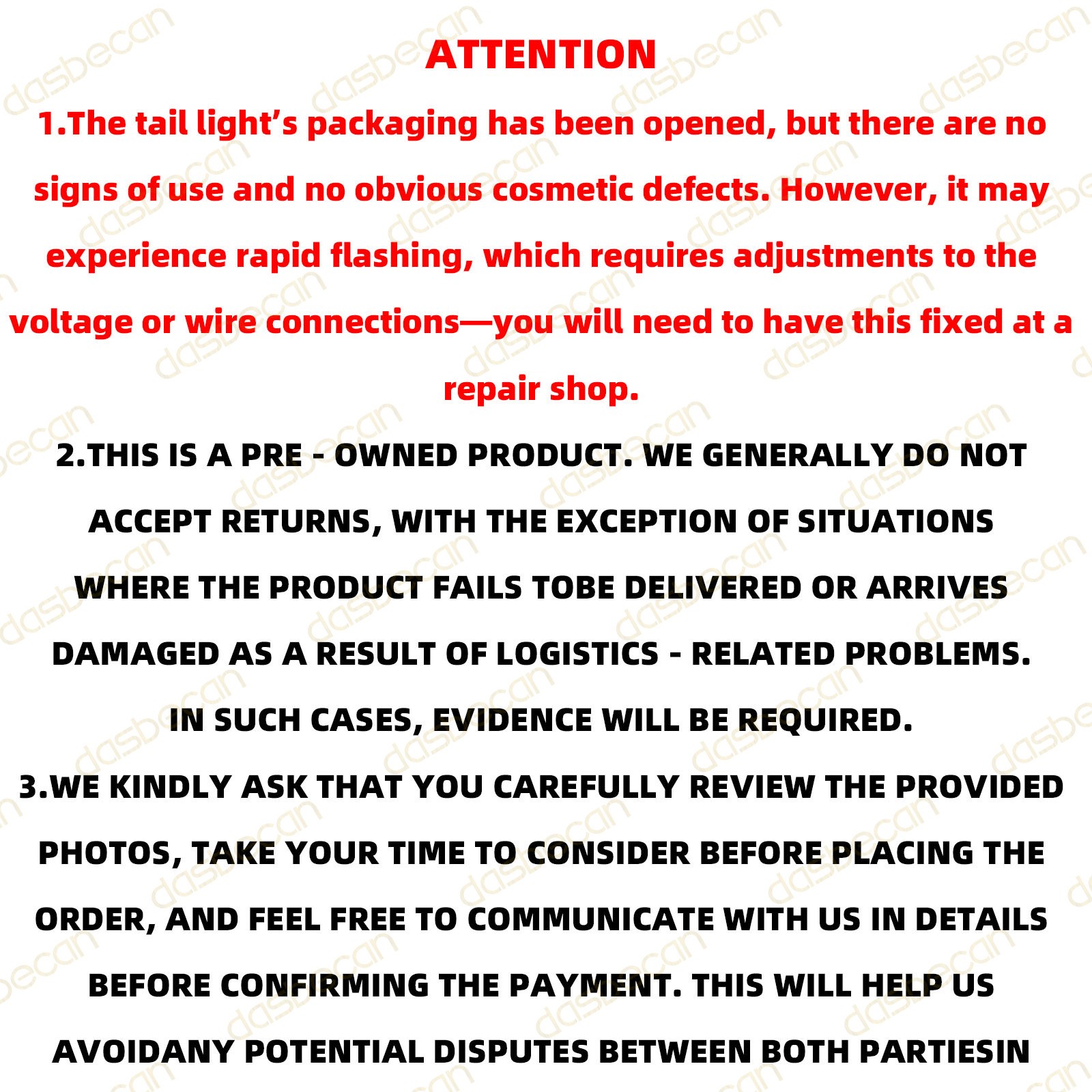 **【Attention】** - **The tail light’s packaging has been opened, but there are no signs of use and no obvious cosmetic defects. However, it may experience rapid flashing, which requires adjustments to the voltage or wire connections—you will need to have this fixed at a repair shop.** - **This is a pre - owned product. We generally do not accept returns, with the exception of situations where the product fails to be delivered or arrives damaged as a result of logistics - related problems. In such cases, evidence will be required.** - **We kindly ask that you carefully review the provided photos, take your time to consider before placing the order, and feel free to communicate with us in details before confirming the payment. This will help us avoid any potential disputes between both parties in the future. Thank you for your understanding, support, and cooperation.** 【 **Compatible With**】2024-2025 Toyota Tacoma **【Replace OE Number】81560-AK050, **81560AK050**** 【 **Description**】 - **Condition:** Used - **Color** **: Black** Housing + **Clear** Lens ( As Pictures Shown ) - **Fitment Type** **:** Direct Replacement - **Placement on Vehicle** **:** Rear, **Left** - **Type** **: LED** Tail Light Assembly - **Light Technology:****LED** - **Parking Light/ Brake Light:** Yes ( Bulb Included ) - **Reverse Light:** Yes ( Bulb Included ) - **Turn Signal Light:** Yes ( Bulb Included ) - **Side Marker Lamp:** No - **Without Tailgate Switch** - **Without Tailgate Button Hole** 【 **Features**】 - Perfect match for the original equipment. - Correct Connector No cutting or splicing. - Easy installation, Plug and Play, Replace directly. No modification needed. ****【**Package Included**】**1Pc Rear Left Tail Light Assembly ( **Without Tailgate Switch******)** **This item doesn't come with manual installation.** ******【**Note**】****** - **Please confirm the product if it matches your car before you purchase.** - No installation instruction included, professional installation is highly recommended! - Due to light and screen difference, the item's color may be slightly different from the pictures. * * * On Oct 27, 2025 at 19:36:10 PDT, seller added the following information:
