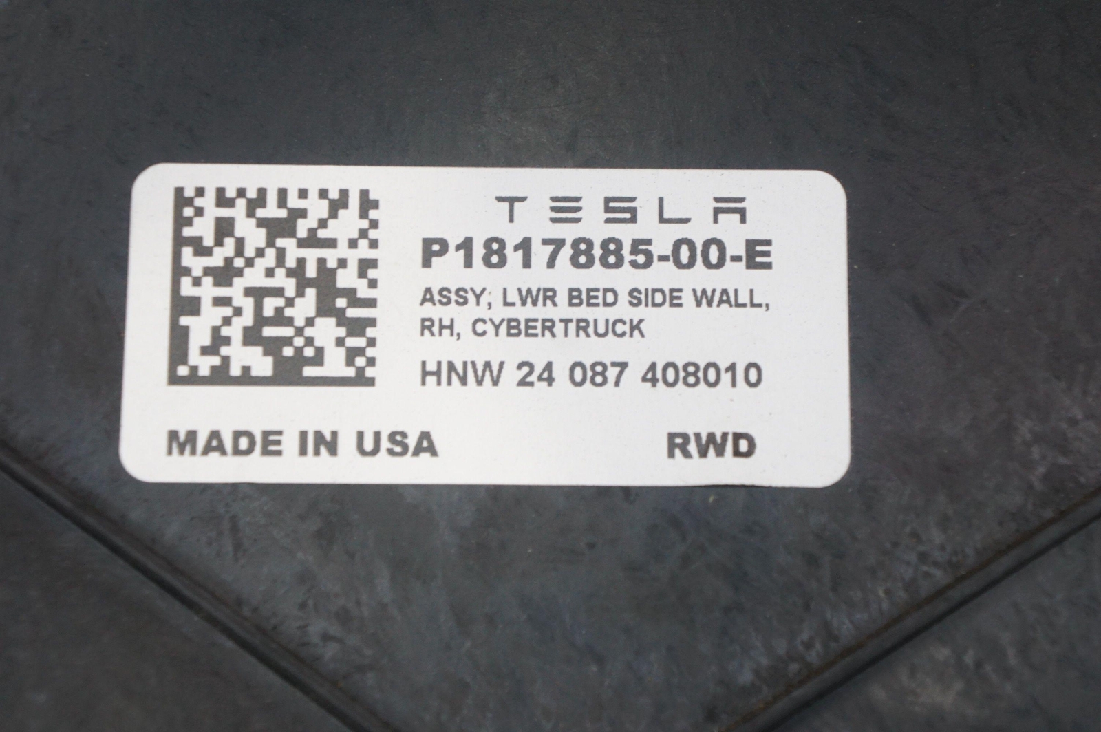 Fast Shipping  Free Shipping  Item Details Description: Rear Right Lower Pick-up Truck Box Bed Side Wall Oem 1817885-00-e Tesla Cybertruck 2024 Model: 24 TESLA CYBERTRUCK VIN of Donor Vehicle: 7G2CEHED3RA008160 Mileage: 6645 Stock Number: 240909 ID No: 0000270727 Location: DA03024X W (228) Please use this table for all final determinations on part fitment, If there is no information here, then you should contact us regarding Interchange Coverage, or match Part Numbers, assess visual similarity, and use additional compatibility sources. Please use the CONTACT US link to send us any questions you have. Happy viewing!  Pacific Motors is an CAR certified, ARA Gold Seal Auto Recycler. If the listed item is an airbag, I certify this airbag is not subject to recall and will be shipped in accordance with hazmat shipping requirements. **\\*\\* NOTE TO ALL BUYERS: All used consumable wear components such as tires, fluids, bushings, etc. are not guaranteed and no warranty is implied. These components are provided with parts assemblies solely as a courtesy to the buyer. Buyers should expect to replace all consumable items with new, roadworthy components as necessary. \*\*** Shipping If this item is listed as being shipped with **Flat Rate Freight**, then it requires the use of a NON-RESIDENTIAL ADDRESS for shipping, or will-call pick-up at a local Freight Terminal. Please take the extra second to add a NON-RESIDENTIAL ADRESS to your account or when checking out. If you check out with a Residential Address, this may add significant time to completion of your order. We generally ship all items out within 24 hours of receiving your order. We are located in Detroit, so most areas of the country are no more than 5 days away. Returns & Payment All of our items come with a 30-day return policy. If, for whatever reason, you are not satisfied with your purchase, please contact us through messaging and we will respond quickly. About Us Pacific Motors is located in Detroit, MI Currently, we are open from 9:00 am to 5:30 pm Eastern Time. Please contact us with any questions or concerns. Contact Us    [