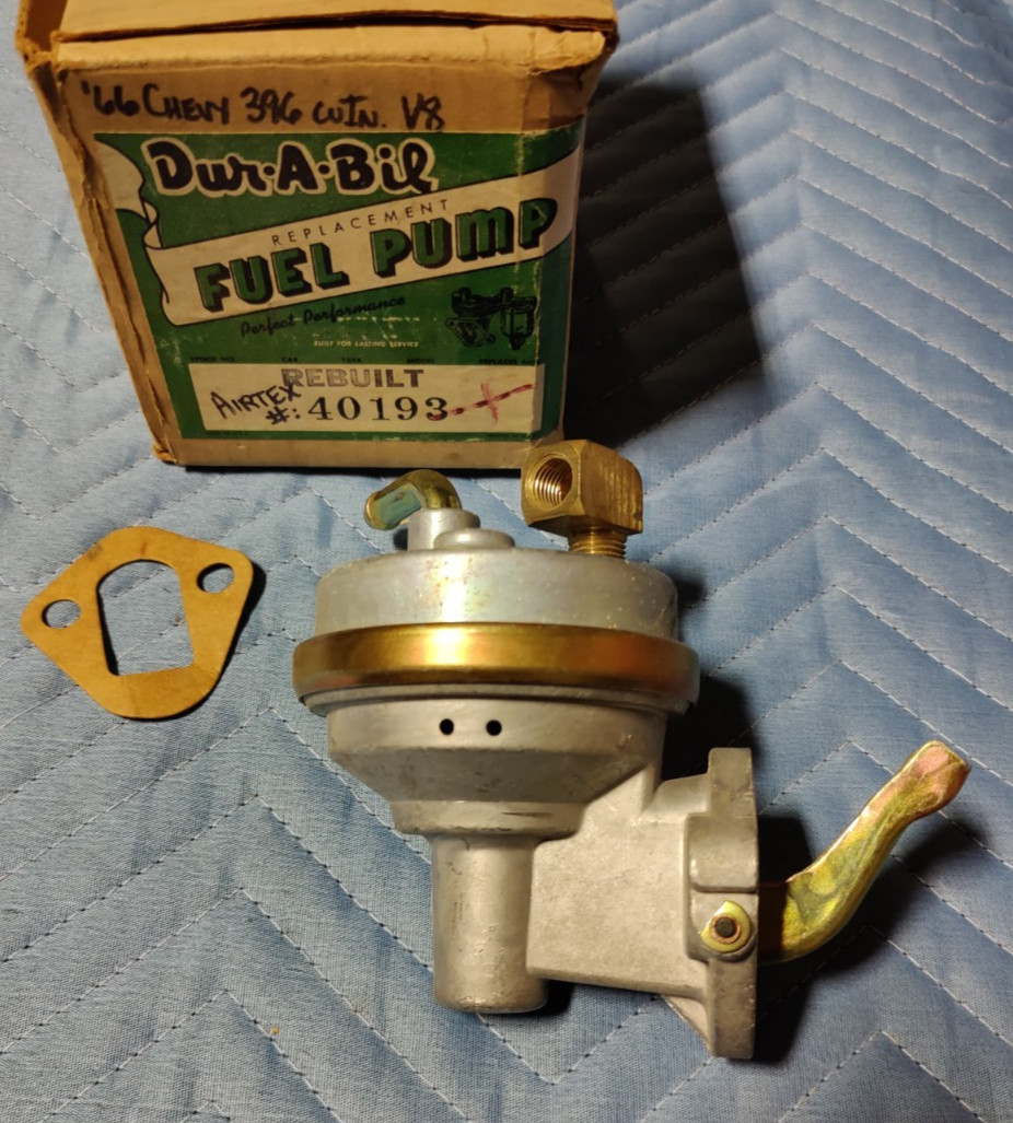 REBUILT Airtex Fuel Pump 40193 fits 1966 Chevy 396 427 V8 models. Fits: 1966 Chevy Belair 427 CID 390HP V8 1966 Chevy Biscayne, Caprice, Chevelle, El Camino 396 CID 325HP & 360HP V8 Please verify your exact application for fitment.