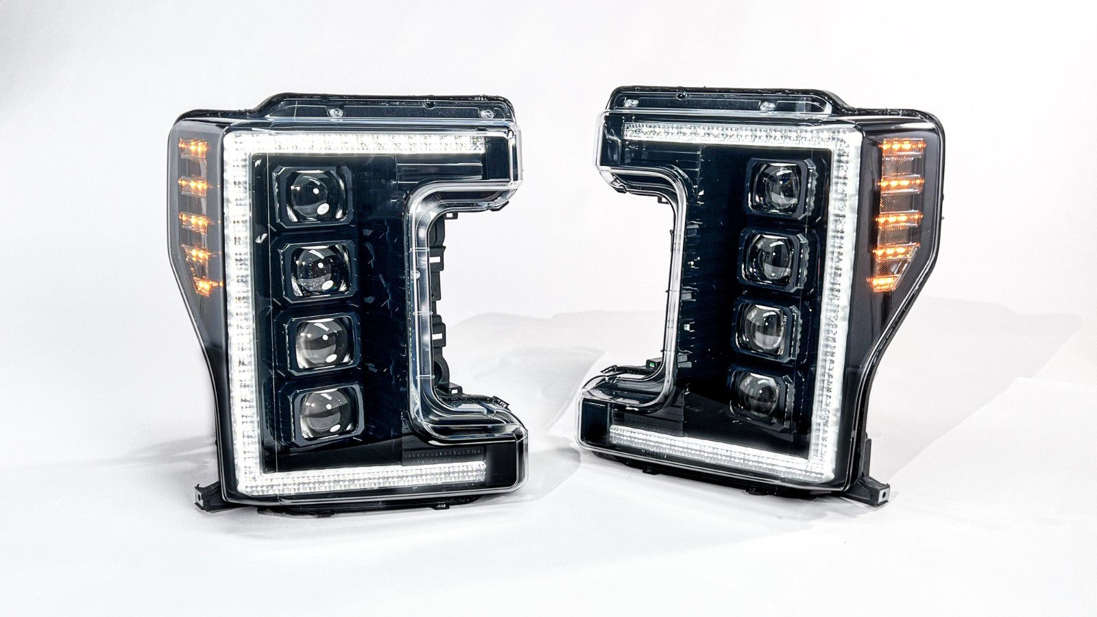 **REFURBISHED 2017-19 SUPERDUTY MORIMOTO XB HEADLIGHTS** - MAIN BEAM: Per headlight these headlights feature 4 low beam LED projectors, and the bottom 2 projectors also function as the high beam to produce a very impressive beam pattern at night. This performance is the best on the market and miles better than your OE halogen or OE led headlights. - DAYTIME RUNNING LIGHT: These headlight feature a very bright white DRL during the day so other drivers around you can see you coming and also adds those extra styling points. - START UP SEQUENCE: To impress everyone around you and bring you into the modern day, these headlight feature a unique start up sequence once you start your truck. - TURN SIGNAL: To add to the uniqueness, a selectable turn signal is fitted inside of these lights. You can choose whether you want a simple flash or a scrolling sequential turn signal. - AMBER SIDE MARKER: To be DOT compliant, amber side marker reflectors are included with these headlights. The side marker is lit up with amber LEDs at night. - ADJUSTABILITY: With all these innovative features, safety was not forgotten. These headlights can be aimed the same way as your OE headlights, so you aren’t blinding oncoming traffic. - COMPATIBILITY: No matter if you have halogen bulbs or LED headlights from the factory, these headlights will work on your truck. ADD A NOTE TO THE ORDER OR SEND US A MESSAGE, which OE headlights you have, and we will include the proper wiring to be plug and play on your truck. - REFURBISHED: These headlights are NOT new, they are REFURBISHED. This means that we take used headlights, inspect all the parts and test them to be fully functional. The parts that need attention are replaced to produce fully functional and new looking headlights that will last you a long time. We also install BRAND NEW headlight lenses to give the headlights a new look. - WARRANTY: We include a 120-day warranty with these headlight FEATURES: - NEW OUTER LENSES - 4 LED LOW BEAM PROJECTORS - 2 LED HIGH BEAM PROJECTORS - WHITE LED DRL (C SHAPE) - AMBER LED TURN SIGNAL - SELECTABLE SOLID OR SEQUENTIAL TURN SIGNAL - CLEAR SIDE MARKER - BLACK INNER BEZEL
