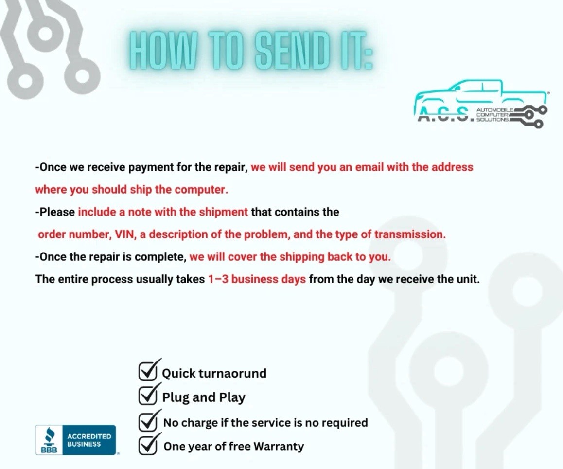Repair & Return Repair & Return is an effective service that we provide for your convenience. Once your order has been placed, you will receive an email from us requesting information needed in order to repair your core. Customers are responsible for shipping charges, and we will cover the return shipping. We offer a free Lifetime warranty with every repair. We offer this repair service with a 1-3 business day turnaround time once we have received your part at our shop. If you need faster return shipping arrangements can be made. If you have any questions please do not hesitate to contact us. WARRANTY All computers have one year of free warranty .