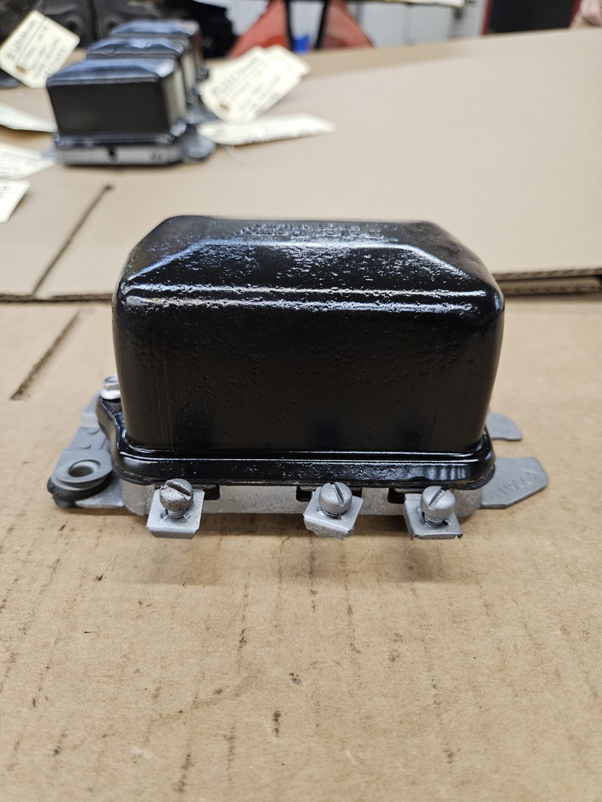 The product is a restored 1956 Corvette Impala Delco voltage regulator part with the manufacturer part number 1119002C. Made by GM Delco Remy, this voltage regulator is specifically designed for the 1956 Chevy Corvette. It features a 12VN voltage regulator and is an interchange part for the 1958 Impala and Corvette. This OE/OEM part is a direct replacement for the original part and comes with the superseded part number 1956 Chevrolet Corvette 12VN voltage regulator. Dated 5J. RESTORED ORIGINAL SO HAS SOME PATINA LIKE DINGS AND PITS. SEE PICTURES FOR CONDITION. #6807HOWARD/MATT