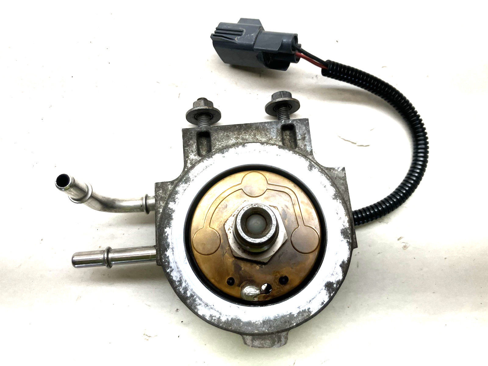 This is a used retrofit fuel water separator housing removed from a 2016 Ram 2500 6.7L Cummins Diesel. Mounts on the crossmember. Appears to be in usable condition. Please see all pictures for the best description of the item's condition. Part # 68197866AC. This item should fit 2015-2016 2500 and 3500 Cummins Rams.