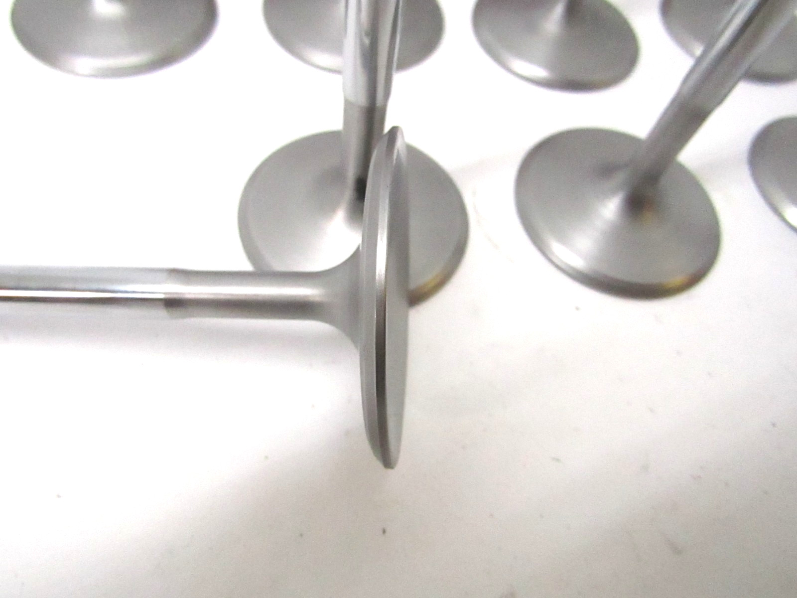 Here is a used set of 8 Rev stainless steel intake valves. Part number on them is X603. They are 11/32 stem, 2.055 head and are about 5.011 long. They are the square groove type. Great shape. Will combine shipping on multiple orders.