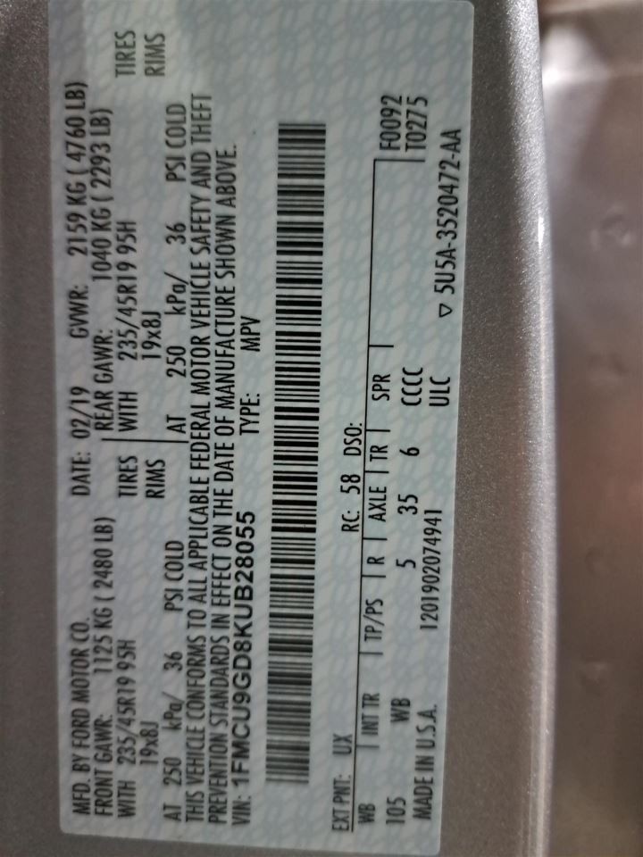 - VIN #: 1FMCU9GD8KUB28055