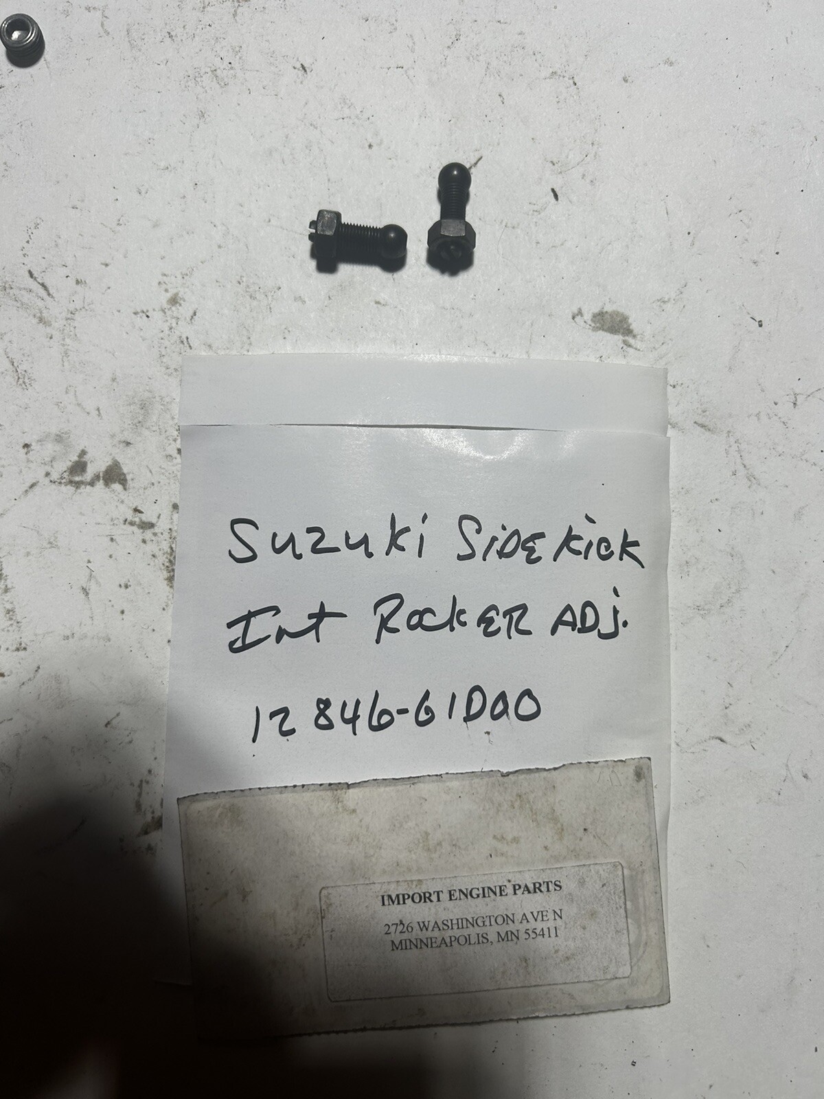 INTAKE ROCKER ARM ADJUSTING SCREW \*USED\* SUZUKI SIDEKICK 1590cc G16K 16V SOHC 1992-1998 12846-61D00 INCLUDED IS NUT 12843-32400 \*USED\* ALSO FITS SUZUKI VITARA 1590cc SOHC 16V G16K 1999-2001 ALSO FITS SUZUKI X90 1590cc SOHC 16V G16K 1996-1998 ALSO FITS SUZUKI ESTEEM 1590cc SOHC 16V 1995-2000 ALSO HAVE INTAKE ROCKERS 12841-71C00 ROCKER SHAFT 12860-71C00 THESE ARE USED ROCKERS, PLEASE MATCH AS USED PARTS ARE NOT RETURNABLE \*\*\*ROCKER ARMS ARE SOLD AS "EACH" ALWAYS\*\*\* EVERY PART NUMBER I HAVE LISTED ON MY E-BAY SITE IS ON MY SHELF, NO DROP SHIP'S FROM VENDORS PLEASE CHECK CATALOG FOR CORRECT FITMENT, QUESTIONS. PLEASE CALL ME NOTE THAT I USE "ITM" AS MY CATALOGING, NOT ALL PARTS SHIPPED WILL BE ITM'S