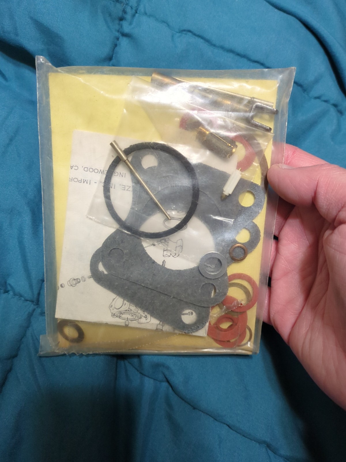 Open package, missing parts for a re-building kit for SU carburetor. Top of the package in marked No. SU-433. The condition of the seals is unknown. Please refer to the photographs. There is a part number seen in the package as part# 111-6150. This package has two gaskets that I believe are not related to the rebuild kit.