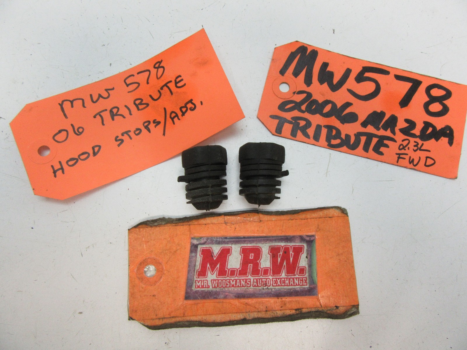 **YOU ARE LOOKING AT ONE USED** **SET OF 2 RUBBER HOOD HEIGHT ADJUSTERS** **, AS SHOWN IN THE PHOTOS.** **IT IS OUT OF A 2006 MAZDA TRIBUTE WITH A 2.3** **L (DOHC) 4 CYLINDER ENGINE & 4 SPEED AUTOMATIC TRANSMISSION, 2 WHEEL DRIVE 2 X 4, EXTERIOR COLOR CODE: G2 REDFIRE METALLIC, INTERIOR TRIM CODE: 5T.** **PLEASE COMPARE YOURS TO OURS IN THE PHOTOS TO BE SURE THIS IS THE ONE YOU NEED FOR YOUR VEHICLE, BEFORE YOU BUY IT.** **IT IS USED BUT IN GOOD CONDITION.** **IF YOU HAVE ANY QUESTIONS PLEASE ASK PRIOR TO BUYING. ALL SALES ARE FINAL. WE SELL EVERYTHING AS-IS, NO RETURNS. LOOK FOR MORE GREAT ITEMS IN OUR STORE. THANKS & GOOD LUCK! MRW488 STOCK# MW578 HOLLANDER# 117-58580** **\*\*\*\*PART IS PULLED OUT AND READY TO SHIP!