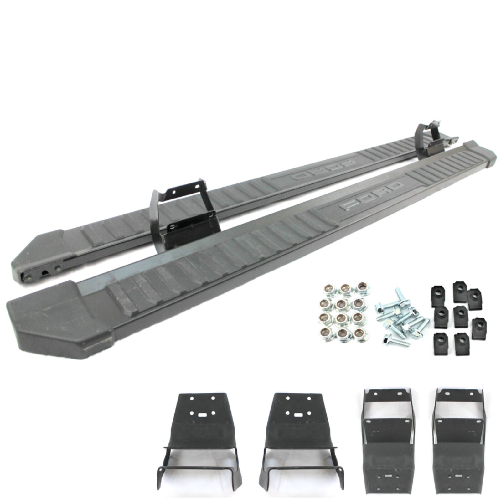 **USA seller!** **For 2017- 2024 Ford F-250, F-350 Super Duty** **Running board side step 2pc set:** **(RH) passenger side + LH (driver side)** **_It comes with 6 brackets - 3 for each side_** **_It will fit any CREW CAB ( full 4-door cab with full rear doors) FORD F250, F350 any trim._** **Fits also:** **2015- 2024 Ford F-150** **The F150 requires only 4 brackets, not 6.** **The Super Duty running board will sit about 1 inch lower than the F150 running board because the bracket is slightly longer.** **_Original FORD PARTS. Take-offs_** **_Carbon black Ford color._** **_It might have some light scratches and chips because of storing and shipping._** **_Hardware included._** **_6 inches wide - 87 inches long._** **_Replaces OEM parts:_** **_#ML3Z16450LB_**_**\- (RH)** **passenger** **side running board - list price 701$**_ **_#ML3Z16451LB_**_**\- (LH) driver** **side running board - list price 701$**_ **_#FL3Z16A506FB_****_\- (RH+LH) running board brackets - list price 79$ each_** _**SHIPPING:**_ **_International_** _**buyers: We are not** **responsible** **for any customs or fees.**_ _**It will be shipped in 2 packages - running boards box + bracket box. 2 Tracking numbers will be uploaded!**_ _**Free shipping only in the lower continental USA. Anybody outside that area would be canceled.**_ _**Local pick up and delivery:**_ _**We could deliver to body shops and businesses around Cumming area. Please call/text for more information.**_ _**These are actual parts. You will get what you see.**_ _**Returns:** Accepted. The buyer pays for shipping back._ _**Payments:** PayPal, credit card, cash, credit card if local pick up. We offer local area delivery for body shops._ _Thanks for doing business with us!_