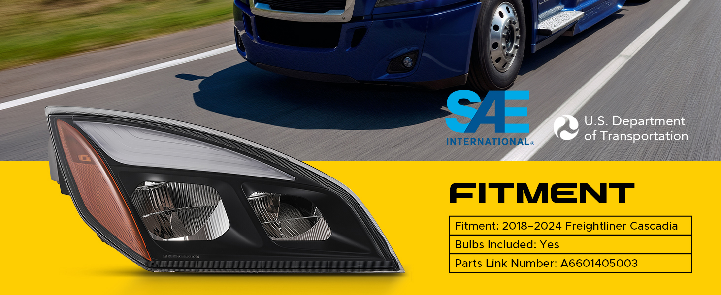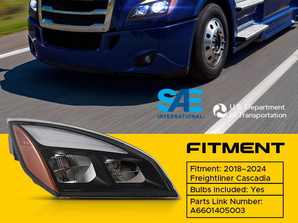 **360° VIEW**   **Description** Enhance your driving safety and vehicle appearance with our passenger side headlight. Specifically designed for 2018-2024 Freightliner Cascadia, this right side headlight installs effortlessly into your vehicle's factory sockets with no modifications needed. Our RH headlight comes with LED bulbs for high & low beams, turn signal, side marker, and daylight running light, so you're ready to hit the road right out of the box. Compliant with DOT and SAE standards and made from durable materials, this headlight replacement offers long-lasting performance. The polycarbonate lenses ensure enhanced light transmittance, helping you drive safely in any condition, whether it's dark, foggy, or rainy. **Features** **Wide Compatibility**: Designed to fit 2018-2024 Freightliner Cascadia, this right headlight replacement by improves visibility and safety during nighttime and foggy drives **Brighter & Clearer Vision**: Enjoy enhanced visibility with high-transmittance polycarbonate lenses. Our passenger side headlight maximizes beam output, making road markings, signs, and potential hazards easier to spot **DOT & SAE Certified**: Drive with confidence knowing this right side headlight assembly meets DOT and SAE standards. The LED low beam lights up the road at night, while the LED daytime running light increases your visibility during the day **Durable & Reliable**: With sturdy polypropylene housing, our RH headlight withstands elements and extreme temperatures from -22°F to 140°F without yellowing or cracking. The fully sealed design protects against water, dust, and fog **Plug & Play**: Our OE-standard passenger side headlight fits directly into your vehicle's original factory sockets with no modifications needed. Adjust the beam angle effortlessly with the built-in screws for the perfect alignment **Specifications** Material: Polypropylene, Polycarbonate Housing Color: Black Lens Color: Clear Fitment: 2018-2024 Freightliner Cascadia Fitment Type: Direct Replacement OEM Part Number: A6601405003 Lighting Technology: LED Bulbs Included: Yes Bulb Types: LED Certifications: DOT, SAE Net Weight: 8.4 lb. (3.8 kg) **Package List** 1x Passenger-Side Headlight Assembly **Q&A** Q1: Is installation easy? A: Absolutely! With a plug-and-play design and pre-installed wiring, installation typically takes just 1–2 hours using basic tools. Q2: Will the headlight turn yellow or fade? A2: Not at all! The UV-resistant polycarbonate lenses stay crystal clear and fresh-looking, even after years of sun exposure. Q3: Are bulbs included with the headlight? A3: Definitely! Our headlight comes with high-quality bulbs pre-installed, so you're all set to go right out of the box.             **360° VIEW**   Enhance your driving safety and vehicle appearance with Our passenger side headlight. Specifically designed for 2018-2024 Freightliner Cascadia, this right side headlight installs effortlessly into your vehicle's factory sockets with no modifications needed. Our RH headlight comes with LED bulbs for high & low beams, turn signal, side marker, and daylight running light, so you're ready to hit the road right out of the box. Compliant with DOT and SAE standards and made from durable materials, this headlight replacement offers long-lasting performance. The polycarbonate lenses ensure enhanced light transmittance, helping you drive safely in any condition, whether it's dark, foggy, or rainy. **Features** - **Wide Compatibility:** Designed to fit 2018-2024 Freightliner Cascadia, this right headlight replacement by improves visibility and safety during nighttime and foggy drives - **Brighter & Clearer Vision:** Enjoy enhanced visibility with high-transmittance polycarbonate lenses. Our passenger side headlight maximizes beam output, making road markings, signs, and potential hazards easier to spot - **DOT & SAE Certified:** Drive with confidence knowing this right side headlight assembly meets DOT and SAE standards. The LED low beam lights up the road at night, while the LED daytime running light increases your visibility during the day - **Durable & Reliable:** With sturdy polypropylene housing, our RH headlight withstands elements and extreme temperatures from -22°F to 140°F without yellowing or cracking. The fully sealed design protects against water, dust, and fog - **Plug & Play:** Our OE-standard passenger side headlight fits directly into your vehicle's original factory sockets with no modifications needed. Adjust the beam angle effortlessly with the built-in screws for the perfect alignment **Q&A** Q1: Is installation easy? A: Absolutely! With a plug-and-play design and pre-installed wiring, installation typically takes just 1–2 hours using basic tools. Q2: Will the headlight turn yellow or fade? A2: Not at all! The UV-resistant polycarbonate lenses stay crystal clear and fresh-looking, even after years of sun exposure. Q3: Are bulbs included with the headlight? A3: Definitely! Our headlight comes with high-quality bulbs pre-installed, so you're all set to go right out of the box. **Specifications** Material: Polypropylene, Polycarbonate Housing Color: Black Lens Color: Clear Fitment: 2018-2024 Freightliner Cascadia Fitment Type: Direct Replacement OEM Part Number: A6601405003 Lighting Technology: LED Bulbs Included: Yes Bulb Types: LED Certifications: DOT, SAE Net Weight: 8.4 lb. (3.8 kg) **Package List** 1x Passenger-Side Headlight Assembly