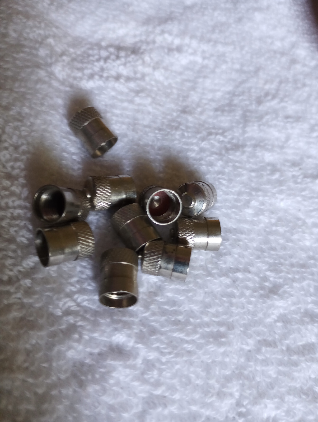 Set Of 10 Heavy Duty Metal Tire Valve Stem Caps. Good used condition with red rubber seals. Chrome plated brass. Thanks for looking.