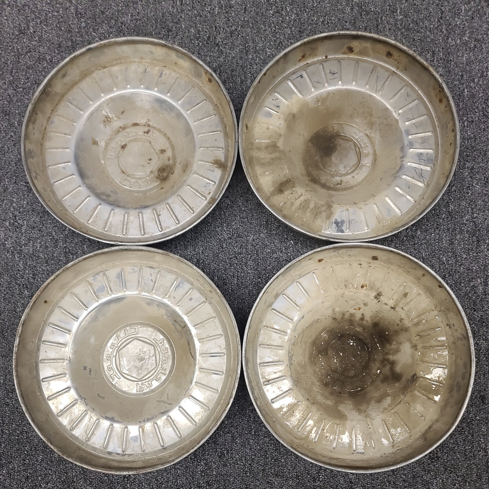 **ITEM: Set of 4 Hubcaps** **THE DEETS: I don't know much about cars but these seem to be in good overall condition. They do need cleaned up as they are "Farm Fresh". Very dusty and dirty but most of the black and red paint seems good. One does have a small dent on the inner ring of one of the caps. Please see all pics to determine physical condition.** **The item in the photo is the actual item you will receive. Please take a look at all of the pictures to get a better idea of what we are offering. If you need this shipped to another address please add the address to your Paypal account before checkout. I will not change the address.** **PLEASE NOTE: IF YOU USE A THIRD PARTY SHIPPING SERVICE TO OBTAIN YOUR ITEMS THIS WILL VOID OUR RETURN POLICY! IF YOU ARE NOT FROM THE UNITED STATES PLEASE USE THE GLOBAL SHIPPING PROGRAM!** **\- PAYMENT & CHECKOUT -** **If you like what you see click "Buy it Now", Immediate payment is required. After paying, sit back and relax, pat yourself on the back! You have completed your transaction and your item will arrive in the next 2-6 days. If I am interested in your offer I will reply to you with an offer which you can accept then pay for your item. PLEASE NOTE, if you Lollygag, Dilly Dally or HemHaw Around when making your payment someone else might swoop in and buy it before you are able to. Please pay when you accept the offer to prevent this from happening. ALSO if you make a ridiculous offer, please expect a ridiculous response, or no response at all.** **\- RETURNS ... ICE ICE BABY -** **We offer a 30 Day Vanilla Ice guarantee on pretty much all of the items we sell. For those of you not familiar with this guarantee, the general idea is "If there was a problem, yo I'll solve it". If we didn't describe an item properly, the item arrived damaged or maybe the item never arrived at all, just let us know. We will stop, collaborate and listen and do what we can to solve the problem. Please contact us BEFORE starting a claim just in case the problem can be resolved outside of a claim. We want you to be happy with your purchase!** **If we sell an item as "PARTS or REPAIR" this means the item does not work properly. Therefore, we will not offer any sort of return on items in that category.** **If you buy a collectible item sold as BRAND NEW, please for the love of all that is holy, DO NOT open the item until you have inspected it. We cannot offer a return on most collectibles if they have been opened. The value of the item drops drastically when you remove it from the packaging.** **\- FEEDBACK -** **If you are like most people, you won't actually leave feedback. BUT if you are a leaver of feedback, PLEASE let us know you are satisfied with your purchase by doing so! We also like the stars, so if you are so inclined please consider leaving us 5 stars. If you aren't happy for any reason, please let us try to make it up to you BEFORE leaving feedback. Feedback is like toothpaste, once it comes out, you can't take it back.** **\- ABOUT US / CONTACT US -** **We are a husband and wife team raising 4 kids in a small town in Indiana. We sell items to provide for our family and to keep both of us from having to have a "real job" (although running a store and raising 4 hooligans is a "real job"). You can find us at many other outlets as well by searching "Thriftalicious"! We are on Instagram, Facebook, Depop, Etsy and we have our very own internet website. We also have a brick and mortar store in Wabash, Indiana.