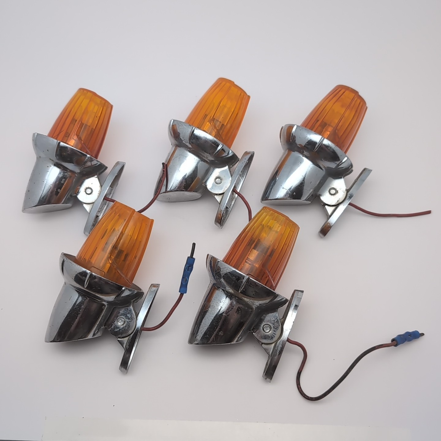 **SET OF 5 VTG International Harvester Signal Stat 13M Truck Roof Cab Marker Light** SEE PICS! You get EXACT FIVE SHOWN. These are rare and in quite good shape for their age! They are MISSING THE RUBBER FOOT that sits at the bottom, due to dry rot over time. Three are marked SIGNAL-STAT 13M SAE-OC 7-171. Two are marked INTERNATIONAL SIGNAL STAT 13M SAE PC 861 799 R92. As a layperson, they all look identical to me. They are UNTESTED but that's simply because I don't know how to test them, there are no known issues with functionality. There's one HAIRLINE CRACK on one of them, but you can't feel it and it doesn't look bad. A few of them have some pitting/wear on the chrome, but overall they're quite nice for their age.