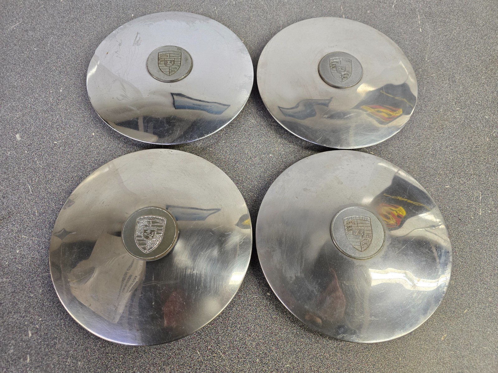 Here is a set of 4 used Porsche chrome disc brake type hub caps with the chrome center caps as used on 1964-65 356C/356SC, 1965-69 912, 1965-77 911, 1976 912E and 1970-72 914-6 models. This hubcap style was introduced in 1964 to designate disc brakes. Units are over 50 years old and have small dings, scratches, scrapes and pitting on the back side so please see pictures!! We have exactly 80 sets (320 Pieces) of these original Porsche disc brake hubcaps in our inventory. These can be shipped anywhere worldwide **.** We at Retro Automotive Products are a small, family owned business located high in the Green Mountains of Vermont that specializes in providing high quality, rare and hard to find original NEW/USED/NOS Porsche parts and accessories. Vermont residents are required to pay 6% state sales tax. ANY ITEM CAN BE RETURNED WITHIN 30 DAYS FOR EXCHANGE OR REFUND IF YOU FEEL THE ITEM IS NOT AS DESCRIBED.