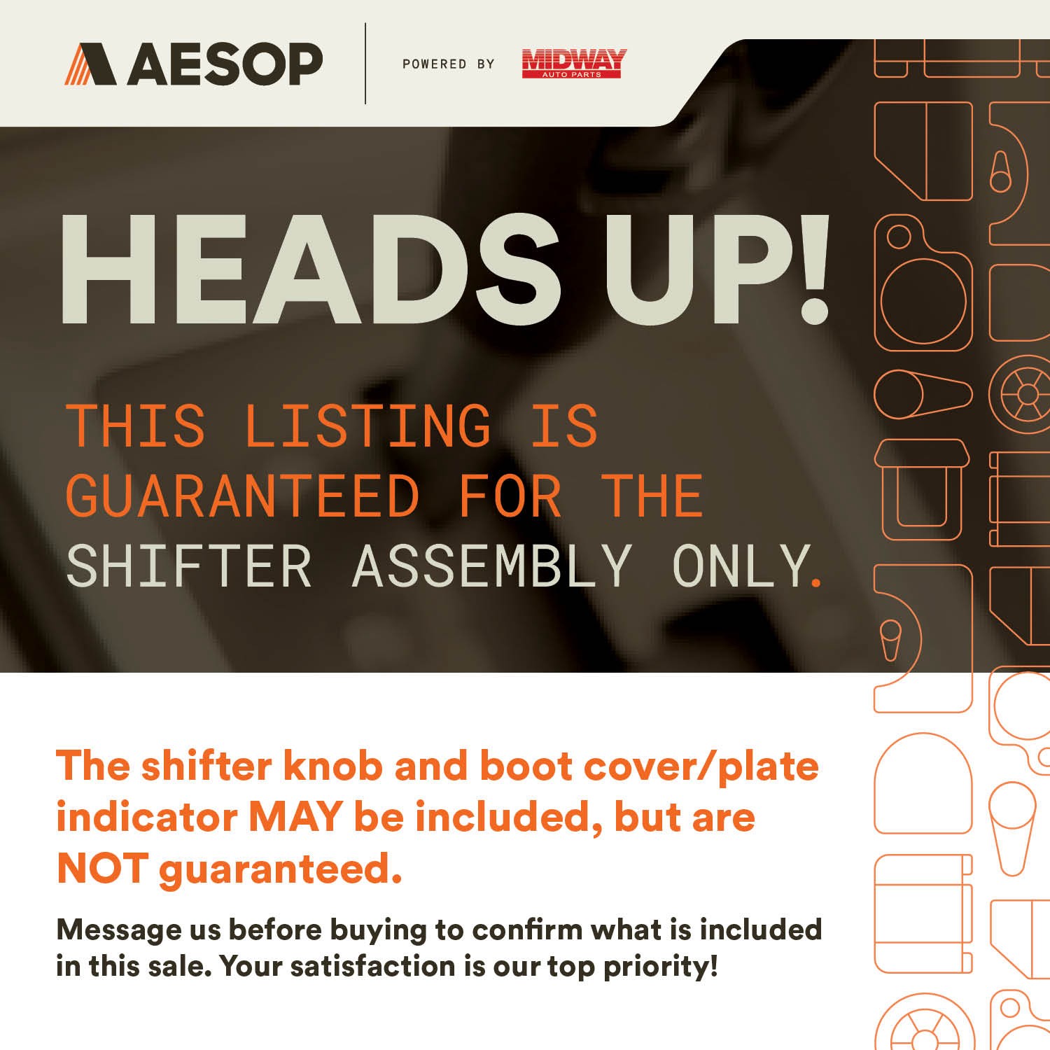 Shifter MALIBU 2017 Transmission Shift 5404380 ### This part is from a 2017 MALIBU with 110000 miles on it. This part has been fully tested while installed and will go through our industry leading quality control inspection before shipping. This part is backed by our **90 Day Money Back Guarantee** at no additional charge. Please include the **Item ID** in your message so we know which part you are asking about. We answer all questions promptly during regular business hours. Our Promise ### **Our Promise** is that you are completely satisfied with every part you buy from Midway Auto Parts ### This part is covered by our **90 Day Money Back Guarantee**. If you have a problem with the part, changed your mind or the part does not fit, simply let us know. You have 90 Days from the purchase date to return it for a full refund. If you need help with returning an item, simply send us a message. We are here to help. About Midway Auto Parts  ### Midway Auto Parts is a proud member of Team PRP. Team PRP is the largest group of independent automotive recyclers in North America. Each Team PRP member uses an identical quality assurance program based on ISO 9000 standards. The result is a nationwide label that delivers consistently high quality parts and maximizes consumer, mechanical repairer, collision center, and estimator confidence. ### If you need a part that we do not have in stock, we can find it from our network of some of the best recyclers in the country. Shipping Information ### All orders placed after 1pm EST will begin being processed by the next business day. Please refer to our current handling time under the Shipping, Returns and Payments section on the listing for when the item will be shipped out. Our facility is closed on weekends and holidays. ### This part will ship via UPS or FedEx with live tracking information. You will receive a message with tracking information as soon as your part ships. Once shipped, please allow up to 6 business days for your part to arrive, depending on your location.