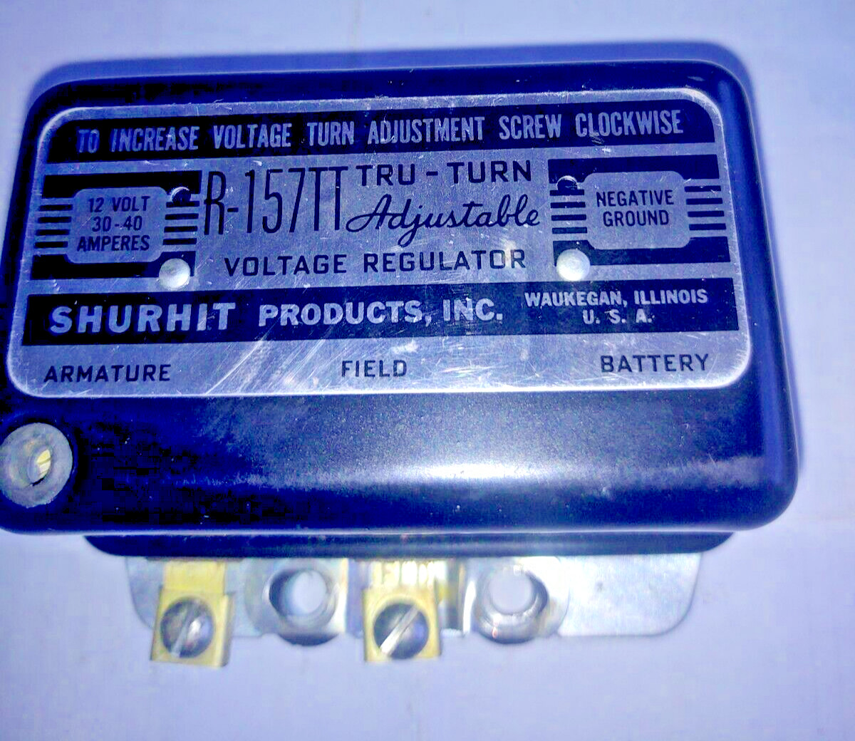 - SHURHIT R-157TT ADJUSTABLE VOLTAGE REGULATOR - 12 VOLTS - 30-40 AMPS - NEGATIVE GROUND - F-605M - SELLING USED, LOOKS NEW, BUT HAS BEEN MOUNTED SEE PICS