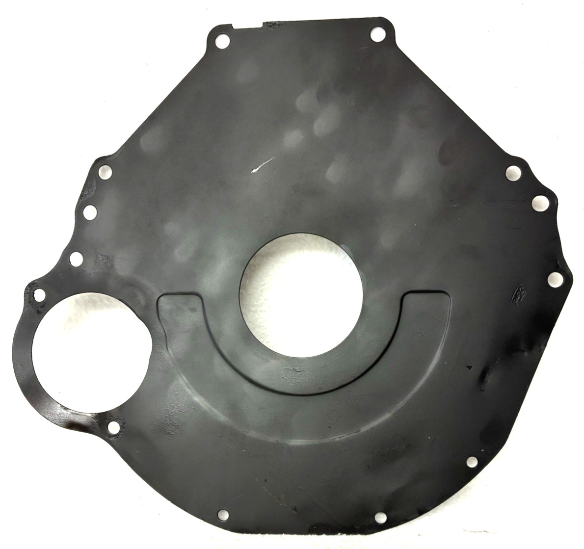 SHOP CLEANOUT FIND. THIS IS A FACTORY FORD BLOCK OFF PLATE AND IT SHOULD WORK WITH ALMOST ANY SMALL BLOCK FORD 68-94ish AND ANY TRANMISSION BUT IT WAS PROBABLY MADE FOR A MANUAL TRANSMISSION SINCE IT IS SOLID (NO CUT OUTS). IT HAS SOME SMALL BENDS, LIGHT PITTING/RUST SO WE PUT A COAT OF BLACK RUST REFORMER ON IT. AS PICTURED, AS IS.