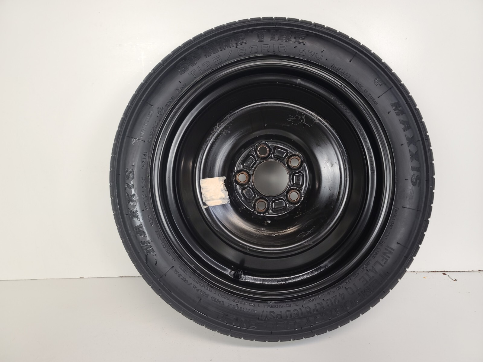 **MINI DONUT SPARE TIRE NOT A FULL-SIZE SPARE COMES MOUNTED WITH THE WHEEL** **FAST AND FREE SHIPPING** **(SORRY WE ARE SHIPPING ONLY TO THE 48 CONTINENTAL USA STATES)** **MAY HAVE FEW SPOTS/STAINS/RUST/SCRATCHES, SEE PICTURES.** **Please magnify and study all images before purchase.** **Please verify tire size and compatibility before purchase.**