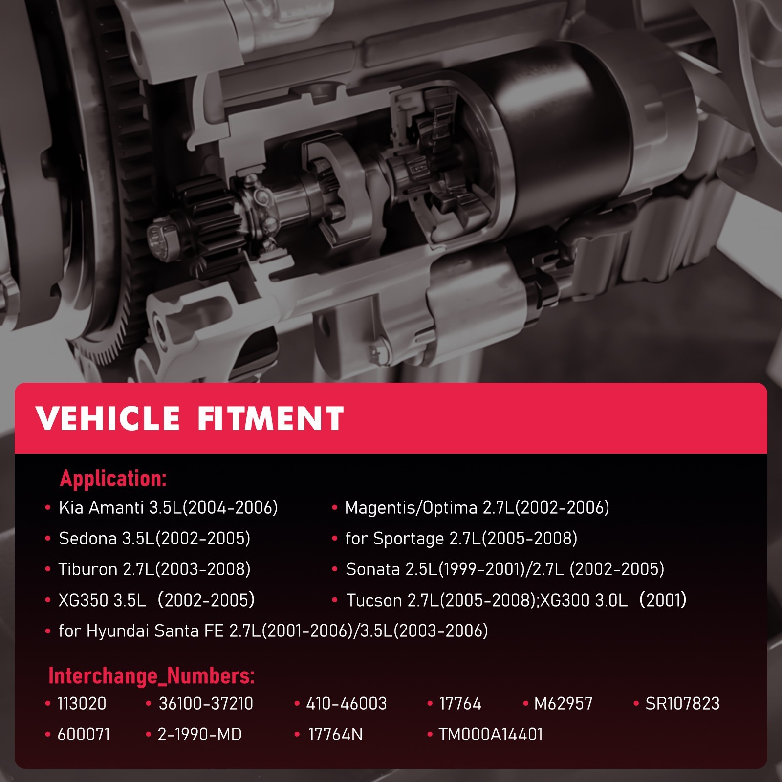 This remanufactured car starter is professionally rebuilt to meet or exceed OEM specifications and complies with US & EU remanufacturing standards. Each unit is fully disassembled, cleaned, inspected, and rebuilt using high-quality replacement components. All critical wear parts including the solenoid, carbon brushes, bearings, plunger, and internal electrical contacts are tested and replaced as necessary. Every starter is 100% bench tested and load tested to ensure proper engagement, cranking torque, and reliability. * * * ### Compatible with below vehicles ### Kia Amanti 3.5L(2004-2006); ### Magentis/Optima 2.7L(2002-2006); ### Sedona 3.5L(2002-2005); ### for Sportage 2.7L(2005-2008); ### for Hyundai Santa FE 2.7L(2001-2006)/3.5L(2003-2006); ### Sonata 2.5L(1999-2001)/2.7L (2002-2005); ### Tiburon 2.7L(2003-2008); ### Tucson 2.7L(2005-2008); ### XG300 3.0L(2001); ### XG350 3.5L(2002-2005) * * * ### Interchange\_Numbers 113020 36100-37210 410-46003 17764 M62957 SR107823 TM000A14401 600071 2-1990-MD 17764N * * * ### Key Features · Remanufactured starter motor · OEM quality replacement · Tested starter with correct voltage & amperage draw · Direct-fit starter replacement (no modification required) · Meets or exceeds original factory performance · Ready to install (professional installation recommended) Cosmetic appearance may show minor handling marks. This does not affect fit, function, or performance. * * * ## Warranty & Returns 12-Month Limited Warranty Includes a 12-month limited warranty covering defects in materials and workmanship under normal operating conditions from the date of purchase. 30-Day Return Policy Returns are accepted within 30 days of delivery for unused and uninstalled items. The product must be returned in its original condition and packaging. Warranty does not cover: Improper installation, misuse, accidents, or vehicle electrical system issues. Proof of professional installation may be required for warranty claims. PayPal is the only online payment method we accept. All Paypal Payments must be Confirmed. Non-Paying bidders will be reported. When you get your package,maybe you will pay some charges, it's taxes for local customs,not pay to us, and the fees are depends on the customs, all buyer are same. ### Delivery details Items will be shipped within 2 business days after payment is received. Import duties, taxes and charges are not included in the item price or shipping charges. Please check with your country customs office for these additional charges. We shipping using UPS or FEDEX from our nearest warehouse to you. Tracking numbers will be emailed upon shipment. ### Terms of sales Please feel free to email us if you have any question. We'll try our best to solve the issue. Refund will be issued once we receive your returned items. Buyer is responsible for all return shipping charges. Please contact us for return process before you return the item. All items for exchange or refund must be returned in "as new" condition. ### About us We are the responsible seller ,always provide high-quality products and best service .If you have any questions, please contact us, and will try our best to help you. Thank you very much!
