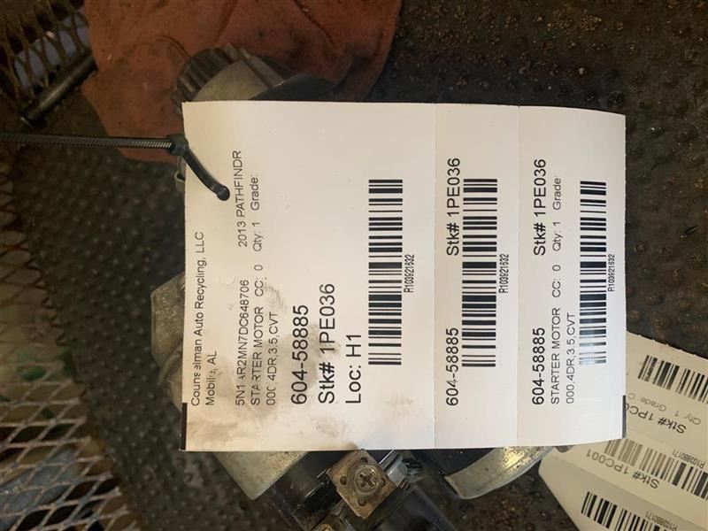 Starter Motor 6 Cylinder Fits 13-14 17 PATHFINDER 103921632 ### **This part requires VIN (Vehicle Identification Number) verification prior to shipping.** ### Please send VIN prior to purchase, or include in your purchase notes. If not, VIN will be requested after purchase, prior to shipping the order. Without VIN verification, orders are subject to seller cancellation. We answer all questions promptly during regular business hours. Monday through Friday 7am-5pm Central Time. **-** **Our Promise** ### Our Promise is that you are completely satisfied with every part you buy from Counselman Auto Recycling ### If you have a problem with the part, changed your mind or the part does not fit, simply let us know. If you need help with how to return an item, send us a message. We are here to help. **-** **Shipping Information** ### This part willl ship with Fedex or USPS with live tracking information. -