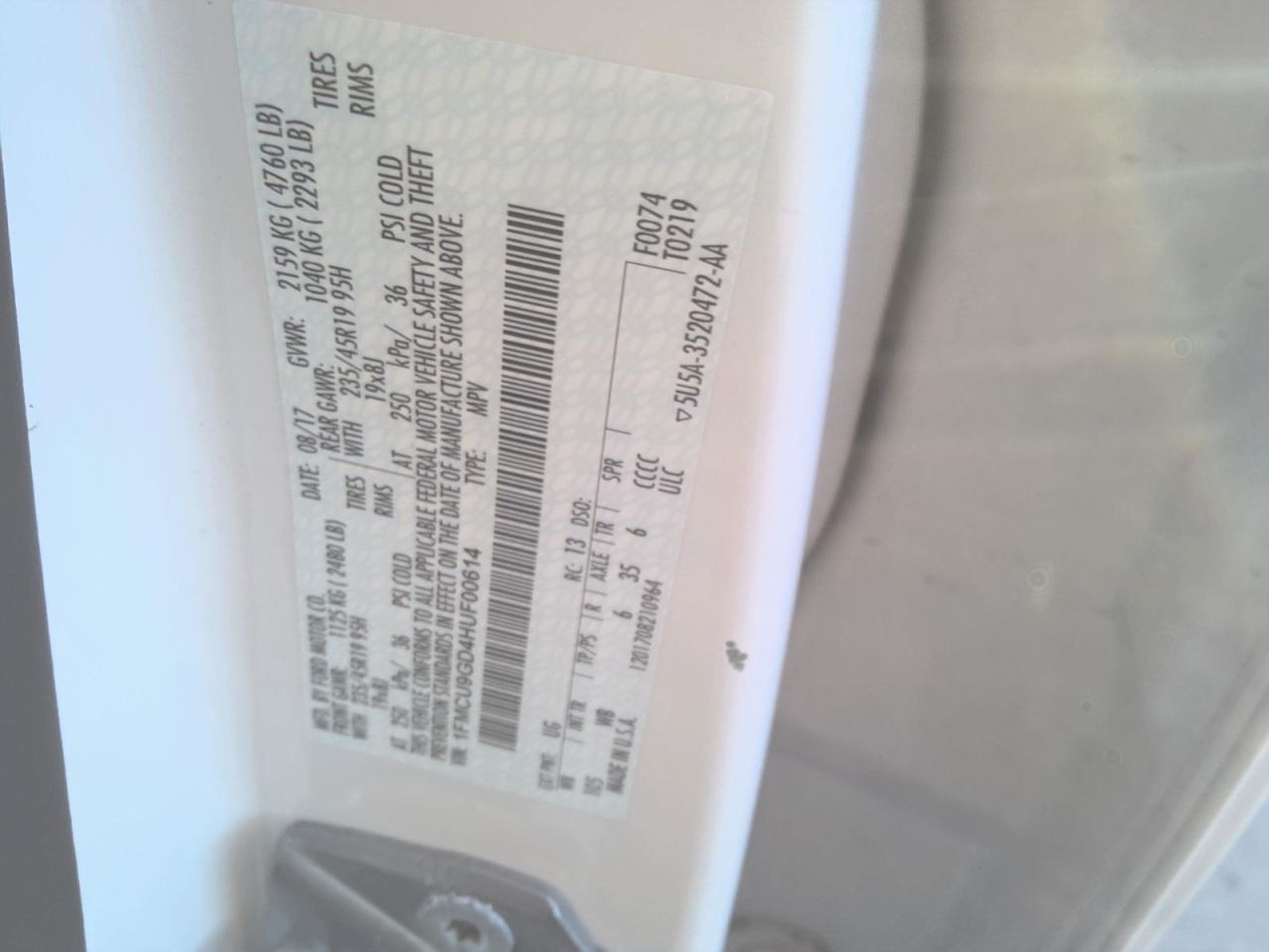 - VIN #: 1FMCU9GD4HUF00614