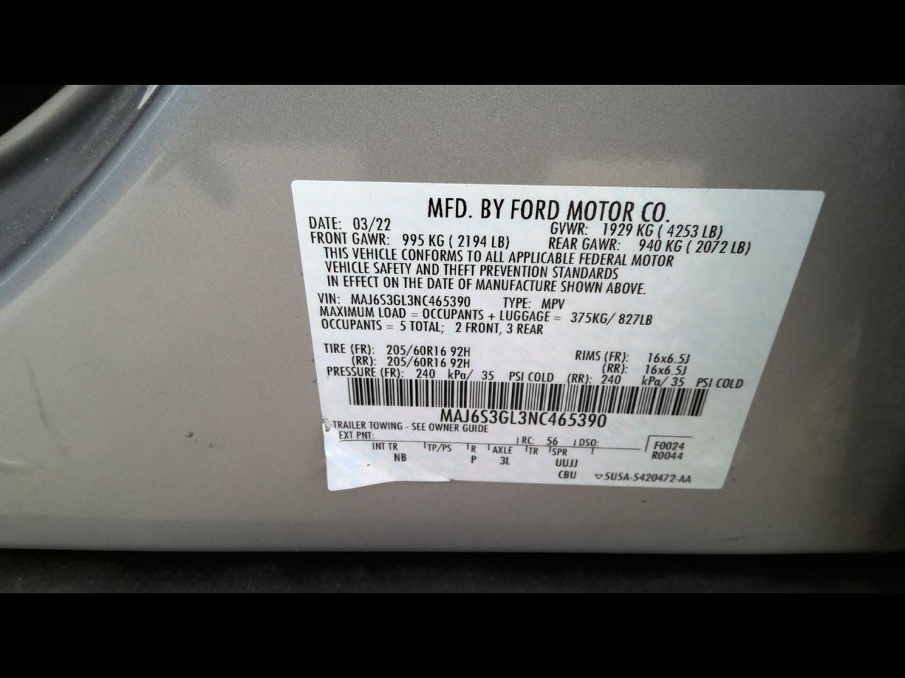 - VIN #: MAJ6S3GL3NC465390