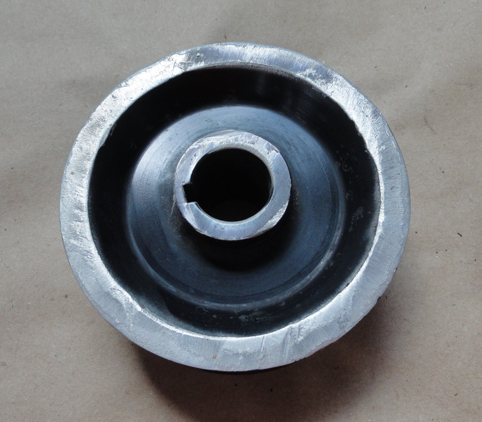Used supercharger pulley. Not sure what we pulled this off from, more than likely a Vortech or Powerdyne. This is a 20mm diameter shaft with key slot, mounts to the supercharger.. 3.25" OD when measured at the belt grooves. This is an 8-rib (7 raised grooves, 8 recessed). Someone grinded one side to either gain clearance for an application, or use it on another application. For those of you changing pulley diameters, a smaller supercharger will produce more boost, a larger pulley diameter will produce less boost. _The item in the photo is the exact item being sold._