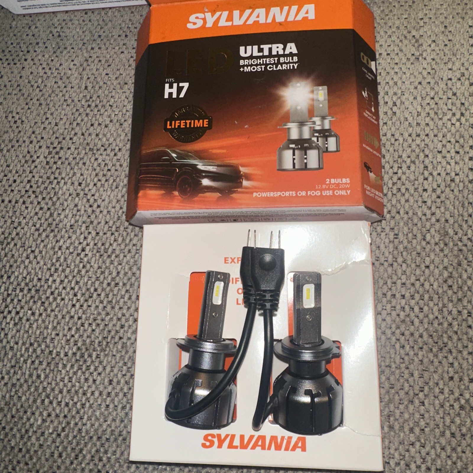 Practically new in the box Sylvania: H7 6000K LED Ultra Powersports & Fog Headlight Bulb (2 Pack). Torn inner box. Guaranteed working!