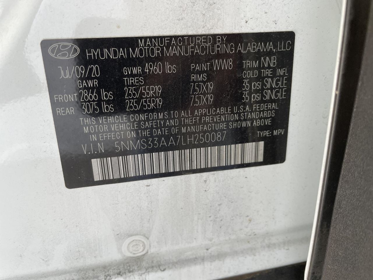 - VIN #: 5NMS33AA7LH250087