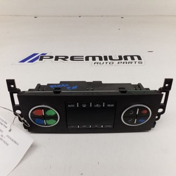 Description Donor Vehicle VIN: 1GNFK36379R259432 Model: SUBURBN15 Year: 2009 Mileage: 205000 (0 = not available or unknown) Stock Number: p21190 Store Number: 1 Part Detail Part Grade: Part Category: U Part Placement: Notes: BLU,LTZ,TAN, BUTTONS ARE FADING This part will fit these makes and models with these options SUBURBAN 1500 07-11 dash mounted, automatic temperature control (opt CJ2) SUBURBAN 2500 07-11 dash mounted, automatic temperature control (opt CJ2) TAHOE 07 dash mounted, automatic temperature control (opt CJ2) TAHOE 08 dash mounted, w/o hybrid option; automatic temperature control (opt CJ2) TAHOE 09 dash mounted, w/o hybrid option; w/automatic temperature control (opt CJ2) TAHOE 10-11 dash mounted, w/o hybrid option; automatic temperature control (opt CJ2) YUKON 07 dash mounted, automatic temperature control (opt CJ2) YUKON 08 dash mounted, w/o hybrid option; automatic temperature control (opt CJ2) YUKON 09 dash mounted, w/o hybrid option; w/automatic temperature control (opt CJ2) YUKON 10-11 dash mounted, w/o hybrid option; automatic temperature control (opt CJ2) YUKON XL 1500 07-11 dash mounted, automatic temperature control (opt CJ2) YUKON XL 2500 07-11 dash mounted, automatic temperature control (opt CJ2) WARRANTY / GUARANTEE **Return Policy** All parts we sell come with a **60 Day Money Back Guarantee** unless otherwise stated. The 60 day period starts when you take possession of the part. We do not cover the cost of labor charges during the installation of your parts. All original shipping costs are non-refundable and will be deducted by a restocking fee once the item is received. We do not cover any shipping costs and will deduct 20% to cover original shipping even if the listing says "free shipping". **Standard Warranty** We offer a standard warranty on all mechanical parts. This covers the part only, no labor charges to install the part. We are not responsible for any improper installation or misdiagnosis. Parts must be installed by a proffessional shop or mechanic. Parts that are disfunctional or bad will require paperwork along with the return or a 20% restocking fee will be applied. SHIPPING NOTESABOUT USHELP **Premium Auto Parts, Inc.** ships to US addresses within the continental 48 states. **Shipping to Alaska, Hawaii, Puerto Rico, APO, FPO or PO Box addresses** is available for select parts only. **Local Pick-up at our facilities is available.** Please contact us prior to your purchase to arrange local pick-up. Buyer must contact us prior to local pick-up. **Items returned by the buyer-** All returns are subject to a restocking fee, this restocking fee is to cover our original shipping costs. Restocking fee will be applied to all items that are returned by the buyer with no fault of the seller. This includes any items ordered incorrectly ( it is 100% buyer responsiblility to check compatability by vin number before ordering). **Please contact us prior to purchasing this part** if you have any questions regarding our business policies, the warranties or guaranties we offer or the fitment of this part with your vehicle. **Parts Grading.** A standard code system is used to communicate the condition and quality of a part between automotive recyclers, automotive repair shops, and insurers. Knowing how these codes are used will help you understand whether the part meets your expectations before you buy it and what you can expect from the part when you receive it. **A Grade** \- The highest quality part. It is of low miles and/or exceptional condition for its age. **B Grade** \- The second level quality part. It is of average miles and normal condition for its age. **C Grade** \- The third level quality part. It has high miles and/or light damage. **No Grade** \- A part that has not yet been graded.