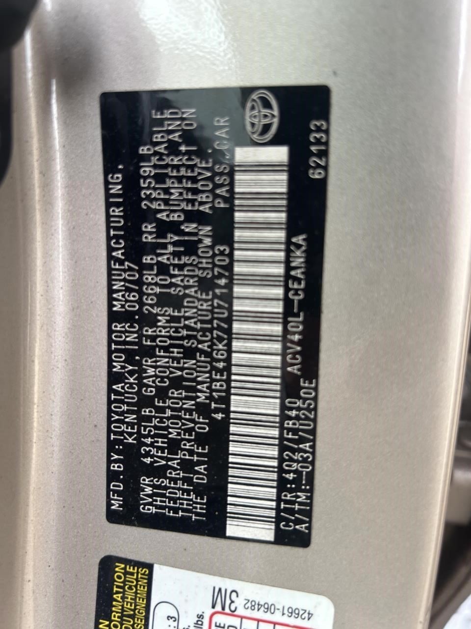 - VIN #: 4T1BE46K77U714703