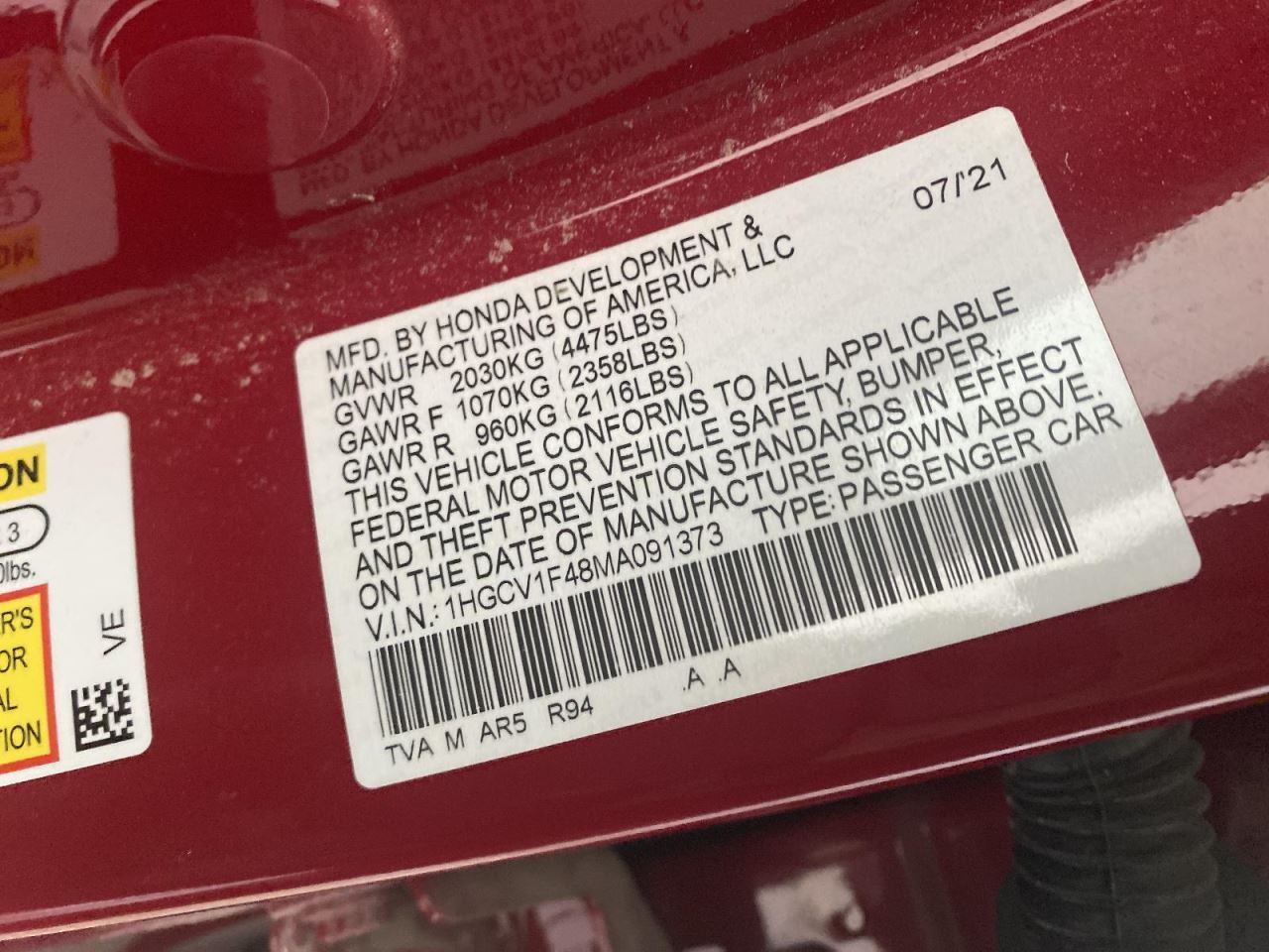 - VIN #: 1HGCV1F48MA091373