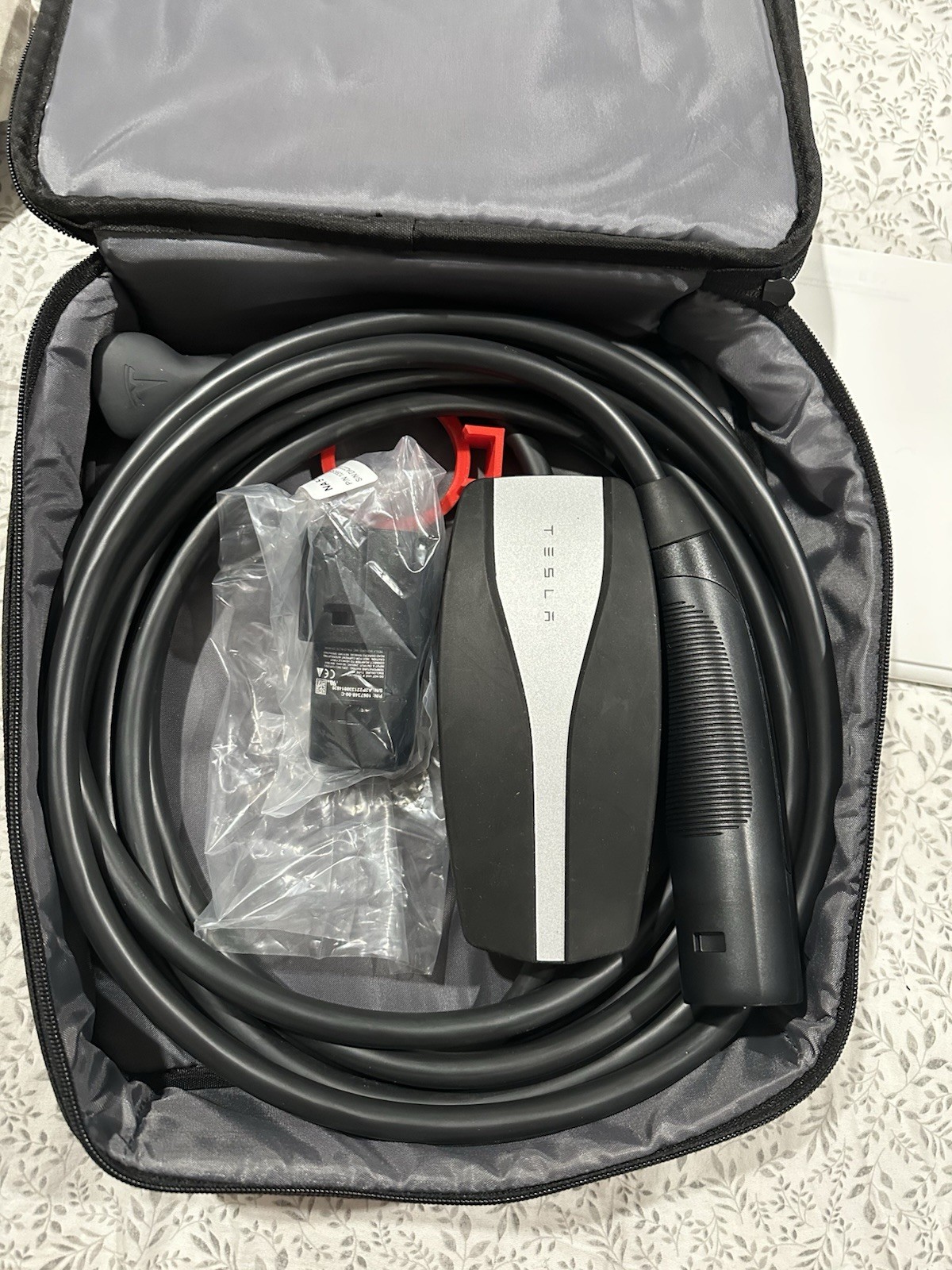 Tesla oem charger, comes with the oem bag and the oem tesla charging adapter j1772.