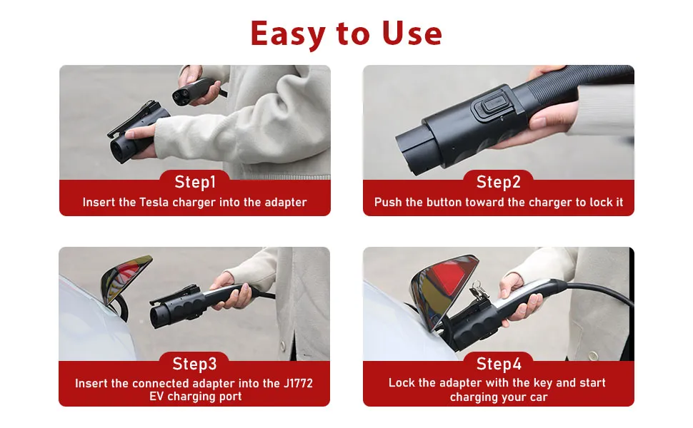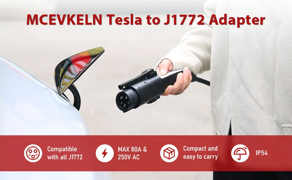Tesla (NACS) to SAE J1772 Adapter This adapter is compatible with all J1772 cars in many brands like Chevrolet,Ford,Nissan,Benz,Kia,BMW,Hyundai,Volvo,Rivian,Porsche and so on. With this adapter, J1772 car owners can choose any 40A,48A and 80A level 1&2 Tesla charging station.(!!!Not compatible with Tesla Superchargers) With the Following Characteristics: - ✔Compatible with all J1772 EVs and PHEVs - ✔Maxium Power of 20kW at 80 A and 250 V - ✔Small volume & light weight - ✔Free Storage Case & Easy to Carry - ✔Strong Weatherability & IP 54 Certified This adapter supports charging power of up to 20kw at 80A and 250V.It weighs only 0.9 lbs and measures 5.12 in\*2.95 in, which makes it smaller and lighter than most Tesla to J1772 adapters on the market. Double Locks & Double Safety The design of this adapter for the lock is for both security and convenience reasons. The key lock is designed to protect adapter from theft , while we kept the original anti-drop lock to ensure the stability of the connection with the convenience of charging. 1.Charging port lock - ✔Adapter can be locked to the car by keys - ✔Prevent the adapter from being stolen (no one can take it except you with the key) - ✔Bring a stable connection between adapter and car. 2.Tesla charger anti-drop lock - ✔Easily push the button towards charging gun to lock the Tesla charger - ✔Prevent the Tesla charger from being dropped(Need to push back the button before unplugging the charger) - ✔Make a stable connection between adapter and Tesla charger. - What to do when the adapter doesn't work? Insert your adapter into the Tesla plug, wait 30 seconds and then plug it into the vehicle. It's very important to plug your adapter first. If the charging process hasn't started, head into your vehicle and press the start button. Once the charging process starts you may turn offyour vehicle and exit it. Make sure the charging station is functional. - What to do when the adapter doesn't work my GEN 2 Tesla Wall Connector? Firstly, you need to make sure the charging station recognizes your vehicle by activating legacy mode.Just do following steps: Step 1:Turn off your charging station's breaker. Step 2: Remove the charging station's cover. Step 3: Find the two dip-switches. Step 4: Put the dip-switch #2 down. - What to do when plug the adapter and the charging rate is too slow? We have received informations that some charging stations may experience issues or saturation.Please, try the next terminal, it should resolve your issue. - What to do when it was charging and the charging process suddenly stopped? With the thermal safety features of Tesla to J1772 Charging Adapter,please try to unplug the charging cable and the adapter. Let it cool down fo 5 to 15 minutes and start charging again. And please make sure it's not an issue with the charging station, Use the next terminal if needed.