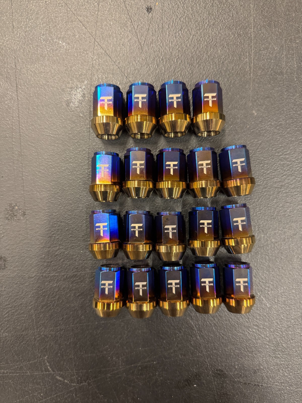T Sportline engineers have designed a line of Tesla specific titanium lug nuts, designed to proper Tesla wheel cone angles, Tesla contact seat depth, Tesla thread engagement length, and Tesla strength requirements. The T Sportline Ultra-Lightweight Titanium Lug Nuts offer a significant reduction in unsprung weight while guaranteeing perfect compatibility and proper fitment with all factory Tesla wheels and all T Sportline wheels. Reductions in unsprung mass improve overall efficiency (less mass moving means less energy used) and improve vehicle dynamics (lighter unsprung masses moving around with momentum during dynamic vehicle actions such as accelerating, decelerating, turning, and navigating roadway elevations. The premium quality T Sportline titanium lug nuts are precision CNC-machined and thread gauge qualified from aerospace-grade, corrosion-free 6AL4V titanium, offered in classic raw titanium finish or PVD (Physical Vapor Deposition) coating. Compatibility - Tesla Model 3, Y, S, X - all factory wheels and all T Sportline wheels - Except not compatible with 21" Arachnid wheels on Tesla Model S 06.2021+ 21x9.5+40 1244228-00-B Arachnid 21x10.5+45 1234229-00-C Arachnid - Enclosed lugs have 1.25" / 31.5mm depth - exposed lugs should not exceed Install Recommendation - Torque to 129 ft-lbs - Re-Torque to 129 ft-lbs after 100 miles of driving **SOLD AS IS** **NO RETURNS**