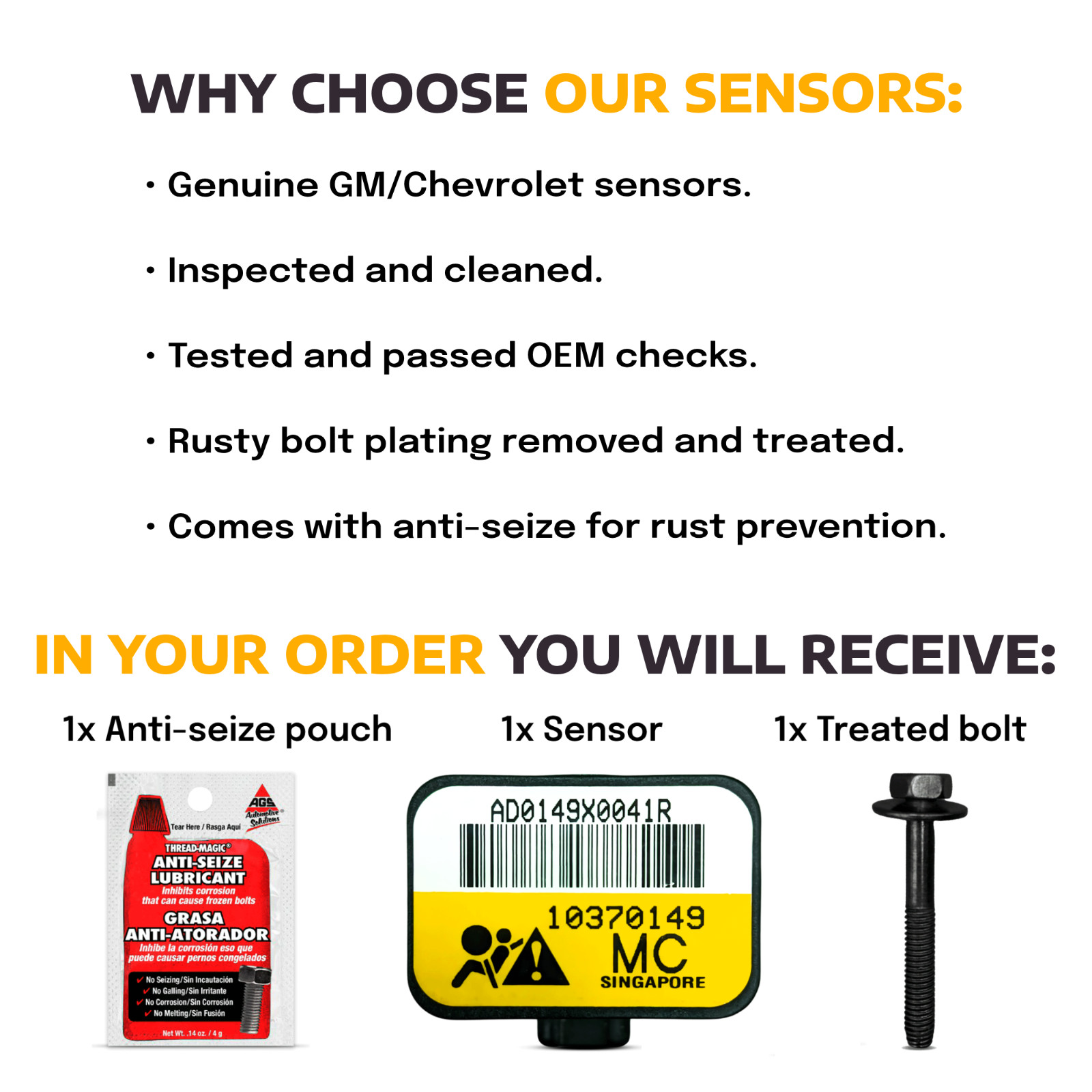 Will fit to 2005, 2006, 2007 Chevrolet Silverado, GMC Sierra, Escalade, Avalanche, Tahoe, Suburban, Tahoe, Yukon. Original GM item. _All of our sensors are tested and pass vehicle system checks._ The sensor's part number printed on yellow sticker should be 10370149, 15103522, or 15057506. You will receive one of these part numbers as they are all interchangeable. We don't always have the correct part number on hand so you please be aware you may receive a interchange part number for your order. Please note all sensors are used and may have slight cosmetic imperfections. #### Important Information: 1. Used Parts: All of our parts are used, tested, and in working condition. 2. No Returns: We do not accept returns. Before purchasing, ensure the part you are ordering is correct for your vehicle. Consult your dealer or mechanic to confirm compatibility. 3. #### Damaged Items: If you receive a damaged item, please contact us immediately with photos and details. We will work with you to resolve the issue promptly. We?re here to help! Shipping: Items are shipped with USPS Ground Advantage or UPS Ground Saver. If you need faster shipping or a specific carrier please send us a message before purchasing an item. Please note that free shipping only applies to the continental U.S. If you are located in Hawaii or Alaska, there will be additional shipping charges. Please contact us before making a purchase so we can determine the exact shipping costs for your location.