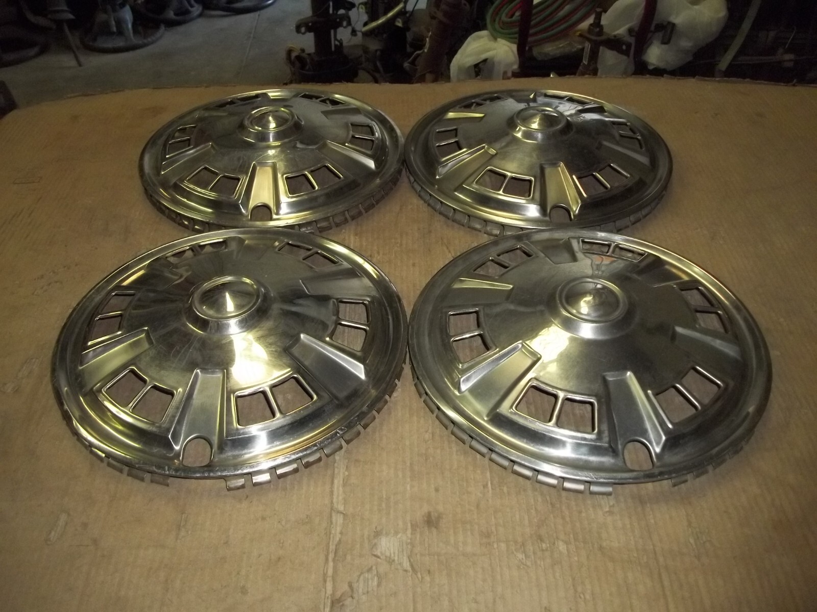A set of FOUR (4) 1971 Toyota Corolla 13" factory full wheel covers.Fit the 13" steel road wheel not 12".Match pictures for correct replacement.This is a VERY used set with MANY deep scratches / scrapes and large dings / dents.These scratches / scrapes and dings / dents will be noticeable from even a short distance.Outer most center sections curb damaged and dented uneven.The original finish is VERY faded and worn due to time.Shine or brightness are different shades.Oxidation and corrosion.Staining that does not polish away.Slightly bent out of round when laid flat but attach to wheels as designed.Mounting teeth on back bent and uneven but attach secure.Poor driver car quality.On a scale from 1 to 10, these rate a "5" or less in condition.Buyer to pay shipping with a flat rate of $20 within the continental U.S..Elsewhere there are additional charges.Accept most methods of payment.California buyer to pay state sales tax.