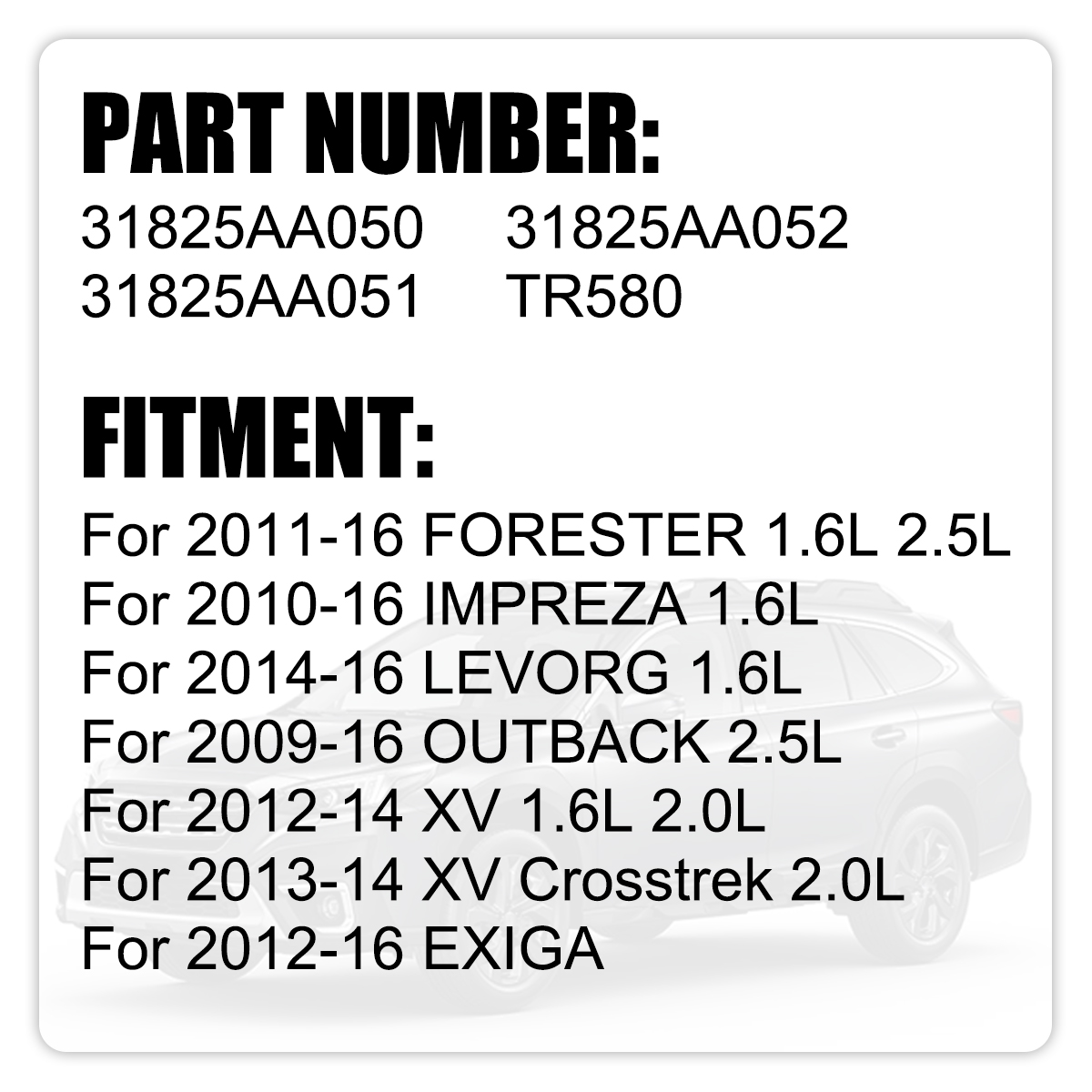 -  -  -  -  -  -  -  -  -  -  -  -  -  -  -  -  Product Description Note: Please Carefully Check Whether the OE Number And Picture are What You Need Before Buying. If You are Not Sure Whether It Fits, Please Write to us. If There are Any Problems, Communication by Letter Will be More Effective. No Instruction Included, professional installation is highly recommended. PartNumber: TR580,31825AA050,31825AA051,31825AA052 Fitment: for 2011-16 FORESTER 1.6L 2.5L for 2010-16 IMPREZA 1.6L for 2014-16 LEVORG 1.6L for 2009-16 OUTBACK 2.5L for 2012-14 XV 1.6L 2.0L for 2013-14 XV Crosstrek 2.0L for 2012-16 EXIGA (Need a picture of your valve body to verify) Packag includes: 1X TR580 Valve Body **❗ Don’t Miss Out on Your $60 Core Deposit!** Your purchase includes a $60 core deposit, which you can get back simply by returning your original part. Prior to processing, the old part must be photographed for our verification. The buyer shall be responsible for the cost of returning the old part. If you don’t return your old part, you’ll be losing the $60 deposit that’s already yours. Help reduce waste and keep valuable parts in circulation – and get your $60 back. As soon as we receive your core in acceptable condition, your deposit will be promptly refunded. Questions? Just message us anytime – we're happy to help. Leaving correct address can minimize delay.** **For any issues with Defects, Return, Item Exchange request, please contact us first and send us a message first before opening any type of case or request. We devote ourselves making EVERY CUSTOMER in 100% Satisfactory and resolve any problem. We highly value and appreciate your business. Thank you.** **No returns will be accepted without an RMA number. Please contact us for the RMA number.** **Return is acceptable within 30 days of delivery.** **Return for replacement or money back is optional.** **Returned items must be in the brand new, unaltered and resalable condition.** **Seller is not responsible for any labor cost, expense in a dealer store, or damage due to wrong installation.** **If you are satisfied with the purchase and our total service, your comment is very important in our business success. We are committed to resolve all issues in a friendly and satisfactory manner. We always reply to messages within 2 business days (off-duty at weekend). If you do not get a response from us, then please check your junk or spam mailbox.** Payment **We accept PayPal only. Leaving correct address can minimize delay.** Terms **For any issues with Defects, Return, Item Exchange request, please contact us first and send us a message first before opening any type of case or request. We devote ourselves making EVERY CUSTOMER in 100% Satisfactory and resolve any problem. We highly value and appreciate your business. Thank you.** **No returns will be accepted without an RMA number. Please contact us for the RMA number.** **Return is acceptable within 30 days of delivery.** **Return for replacement or money back is optional.** **Returned items must be in the brand new, unaltered and resalable condition.** **Seller is not responsible for any labor cost, expense in a dealer store, or damage due to wrong installation.** Returns **If you are satisfied with the purchase and our total service, your comment is very important in our business success. We are committed to resolve all issues in a friendly and satisfactory manner. We always reply to messages within 2 business days (off-duty at weekend).