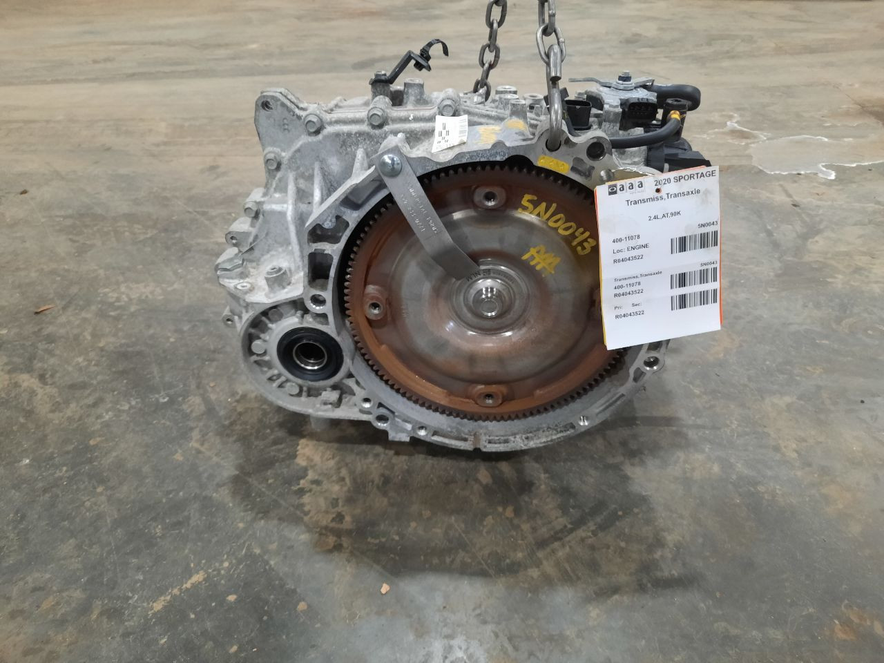 Item Description **6 MONTH WARRANTY!! 60 DAY NO HASSLE RETURNS!!** **This for a USED OEM Transmission/Transaxle Assembly pulled from a 2020 SPORTAGE with 90000 actual miles on it.** **Here are our part notes about this specific part:** **2.4L,AT,90K** **Our Part #: 400-11078, 4043522** **Our Stock#: 5N0043** Please see the fitment section below to make sure this will fit your vehicle. Pay special attention to any options listed!!! In some cases, it may only fit vehicle with certain options or specific ID#s as listed below. **SPORTAGE 20-22 (AT), 2.4L, FWD** Whats Included? Whats Included? FAQ/ Help Shipping Payment Returns/Warranty #### Whats Included? ``` Here is a short description of what will generally be included with your item. If you would like more information or are unsure if something will come with your item, PLEASE ASK!! A/C Compressor: Includes the clutch/pulley assembly A/C Condenser: Sensors and hoses are not included ABS Units: Include the ATTACHED electronic module unless otherwise noted Alternator: Includes the pulley. Any brackets are not included Axle/CV shaft: Does not include the axle nut Blower Motor: Include the squirrel cage/fan blade Caliper: Includes the bracket and slides. Slides are not covered under warranty Column Switch: Includes wiring (if applicable) up to the first point it can be unplugged Control Arm: Includes the ball joint and any bushings Coolant Overflow Bottle: Cap is included Cowl Vent Panel: See Our Part notes, often sold as one side only Differential Carrier: Does not include axles Door Trim Panel: Includes handle and armrest. Does not include window/lock switches Engine: Included for convenience unless otherwise noted. These parts are not covered under warranty: Intake manifold, fuel injectors, oil pan, sensors, water pump Not included: Throttle body, Turbo, wiring harness exhaust manifold (may be left on in certain cases) Exhaust Manifold: Does not include turbo where applicable Fan Assembly: Includes motors, shroud, and blades. Fuel injectors: See our part notes Fuel Filler Door: Includes hinge. Does not include bolts/hardware Fuel Pump: Includes sending unit and any molded hoses that are non-removable Headlight: Brackets are included unless otherwise noted. HID headlights include the bulbs and ballast Hub: Includes wheel studs Ignition Coil(s): See part notes Interior Rear View Mirror: Does not included bracket glued to windshield Jack: See part notes. If noted as assembly, it will include the lug wrench Mass Airflow Sensor: Does not include housing unless pictured Power Steering Pump: Includes pulley and ATTACHED reservoir. Remote reservoirs and brackets will not be included Power Steering Gear: Includes pitman arm Rack and Pinion: Includes tie rods but they are not covered under warranty Radio: Pay special attention to our fitment description. Often times radios are more than one piece and we sell them each separately Spindle/Knuckle: Does not include hub unless noted Starter: Includes solenoid Strut: Struts are left assembled and include top plate, spring, and dust boot (dust boots on used struts are rarely in perfect shape) Stabilizer Bar: Does not include links or bushings Sunvisor: Does not include clip Taillight: Pay special attention to fitment as we list the trunk lid mounted taillights as well as the corners. Does not include bulbs Temperature Control: Includes all knobs, buttons, and sliders Throttle Body: Includes sensors but they are not covered under our warranty Transmission: Automatic transmissions include torque converters and sensors. Many newer transmissions require a relearn/programming procedure. Manual transmissions do not include any part of the clutch system. Transfer Case: Does not include electric shift motor Washer Reservoir/Bottle: Includes cap unless noted Wheel/Rim: Does not include center cap, tire, or lug nuts Window Regulator: Does not include motor unless noted (most are noted with motor) Wiper Motor: Does not include arms or transmission unless noted Wiper Transmission: Does not include motor or arms unless noted ``` FAQ/ Help #### FAQ/ Help ``` Will this fit my vehicle? Is this the right part? This is the most common question that we get. The fitment information can be confusing if you don't buy replacement parts everyday. Please contact us if you are unsure!! We try to respond to questions as quickly as possible and we are more than happy to answer any questions as best as we can. In order to speed up the process, it is very helpful, but not required, for you to send us your full VIN number along with your question. It looks like its the same color as my car, how can I tell for sure? The best way is to match the manufacturer paint code. Most of the time we include the paint code in our part notes. If you don't know what a paint code is or where yours is located, please feel free to ask. We are happy to help. I only see photos of the vehicle and not the actual part you are selling. Can you send me some? Our most recent listings include actual photos when we can provide them. If you would like an actual photo, we are more than happy to take one after the purchase for your approval before the part ships. In certain cases we will take actual photos before a purchase is made. This is on a case by case basis. Send us a message and we will let you know if it is possible for us to do so I see a wheel that says it is "B" condition, what does that mean? Grading of parts is a very subjective process but we do our best to keep it uniform. Here is a brief description of wheel grades: A Condition, A-COND = This is the highest grade used wheel. It will have very minor imperfections but will be in better condition than 90% of vehicles on the road. B Condition, B-COND = This wheel will have some cosmetic imperfections. It is in average condition for the year and mileage of the donor vehicle. It may have minor scratches and clear coat peeling. This is still a fairly nice looking, used wheel C Condition, C-COND = This whe