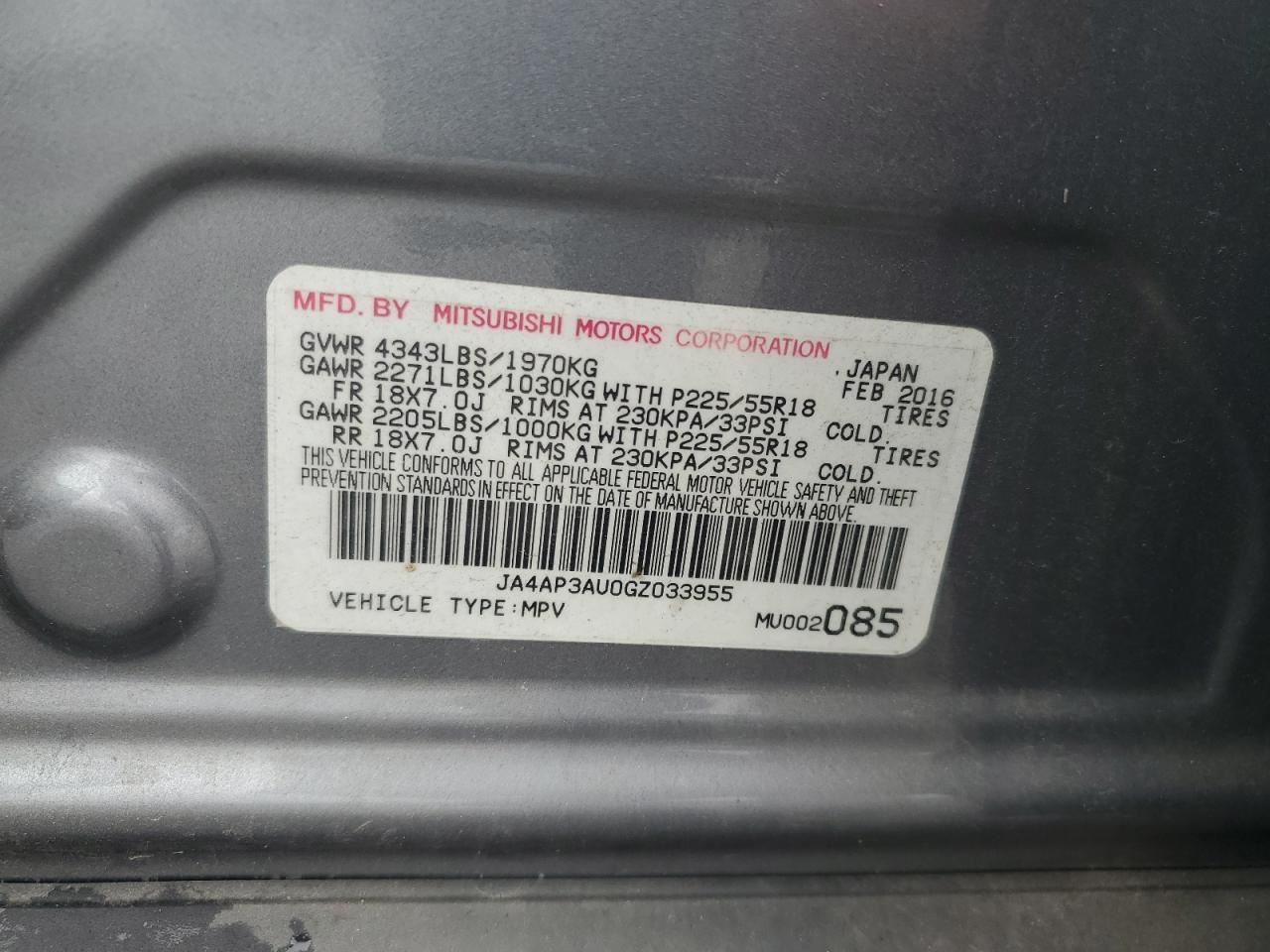 - VIN #: JA4AP3AU0GZ033955