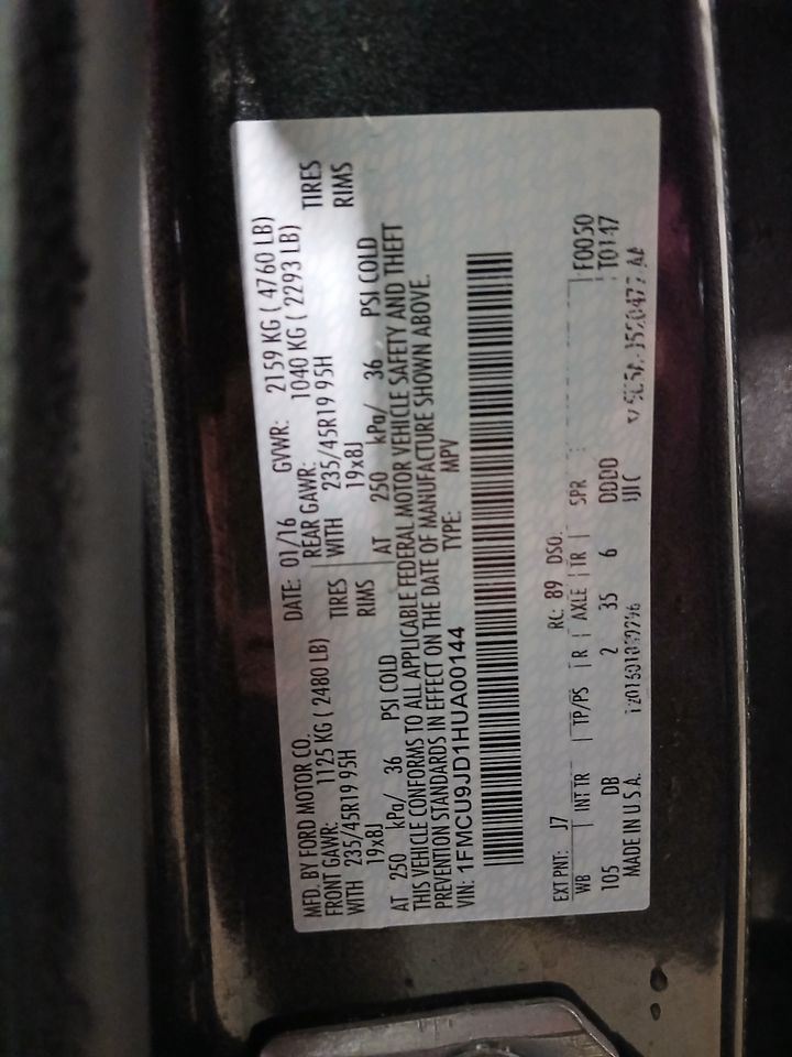 - VIN #: 1FMCU9JD1HUA00144