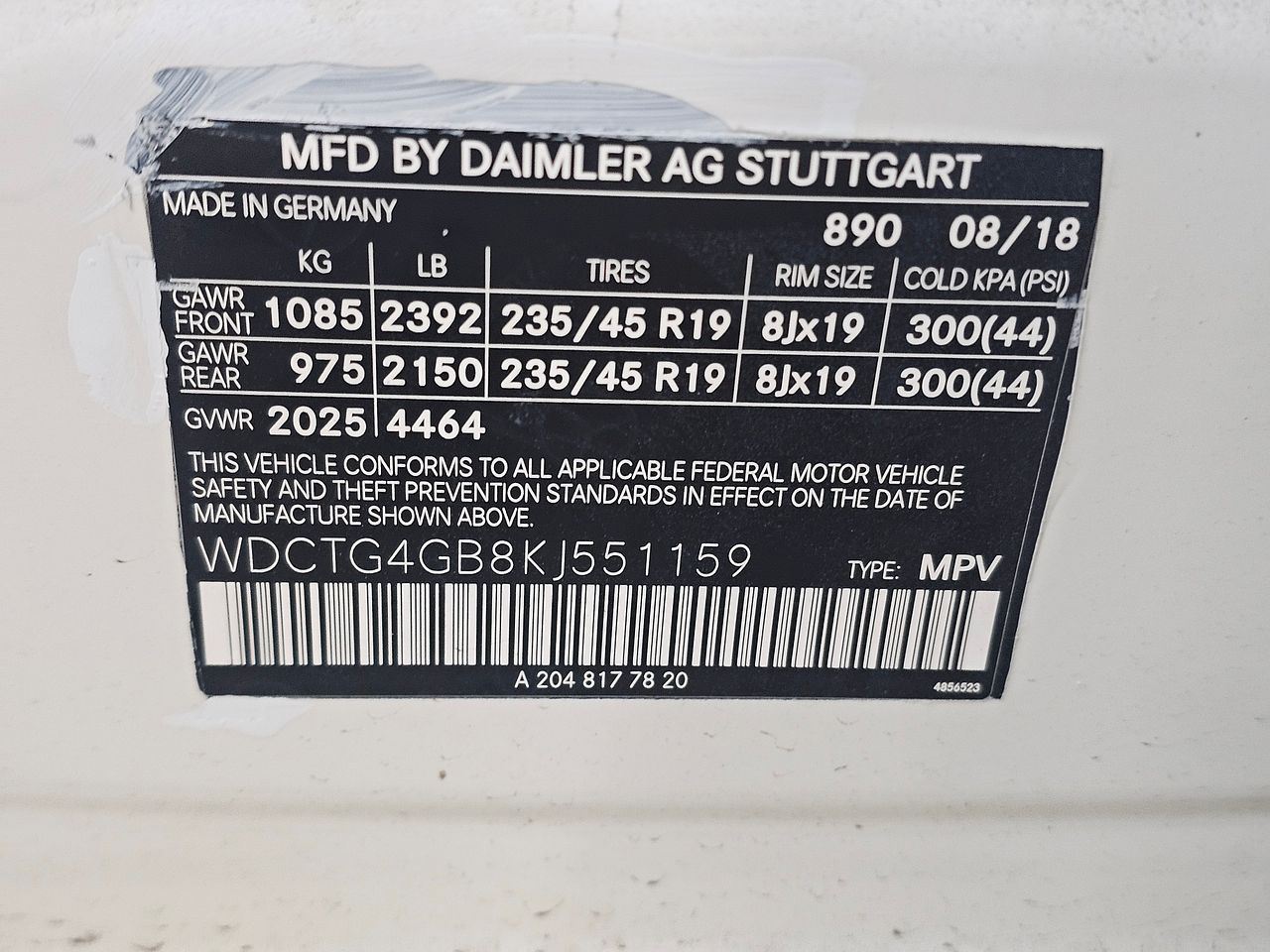 - VIN #: WDCTG4GB8KJ551159