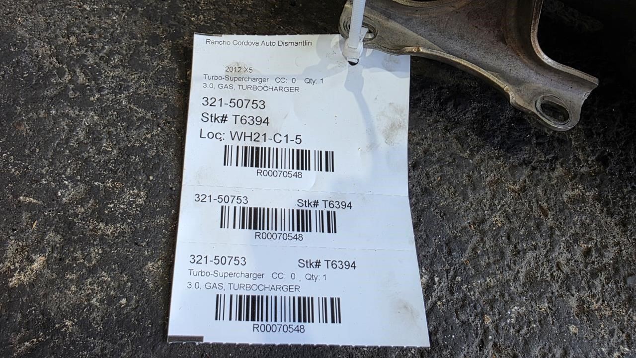 Description Donor Vehicle VIN: Model: X5 Year: 2012 Mileage: 0 (0 = not available or unknown) Stock Number: T6394 Store Number: 1 Part Detail Part Grade: Part Category: U Part Placement: Notes: 3.0, GAS, TURBOCHARGER This part will fit these makes and models with these options BMW X5 11-13 3.0L, gasoline (turbo) BMW X6 11 Base, 6 cylinder (xDrive35i, 3.0L, turbo) BMW X6 12-14 6 cylinder (xDrive35i, 3.0L, turbo) WARRANTY / GUARANTEE **Return Policy** All parts we sell come with a **30 Day Money Back Guarantee** unless otherwise stated. The 30 day period starts when you take possession of the part. We do not cover the cost of labor charges during the installation of your parts. All original shipping costs are non-refundable. **Standard Warranty** We offer a standard warranty on all mechanical parts. This covers the part only, no labor charges to install the part. We are not responsible for any improper installation or misdiagnosis. SHIPPING NOTESABOUT USHELP **Rancho Cordova Auto Dismantling** ships to US addresses within the continental 48 states. **Shipping to Alaska, Hawaii, Puerto Rico, APO, FPO or PO Box addresses** is available for select parts only. **Local Pick-up at our facilities is available.** Please contact us prior to your purchase to arrange local pick-up. Buyer must select 'Buy It Now' prior to local pick-up. **Please contact us prior to purchasing this part** if you have any questions regarding our business policies, the warranties or guaranties we offer or the fitment of this part with your vehicle. **Parts Grading.** A standard code system is used to communicate the condition and quality of a part between automotive recyclers, automotive repair shops, and insurers. Knowing how these codes are used will help you understand whether the part meets your expectations before you buy it and what you can expect from the part when you receive it. **A Grade** \- The highest quality part. It is of low miles and/or exceptional condition for its age. **B Grade** \- The second level quality part. It is of average miles and normal condition for its age. **C Grade** \- The third level quality part. It has high miles and/or light damage. **No Grade** \- A part that has not yet been graded.