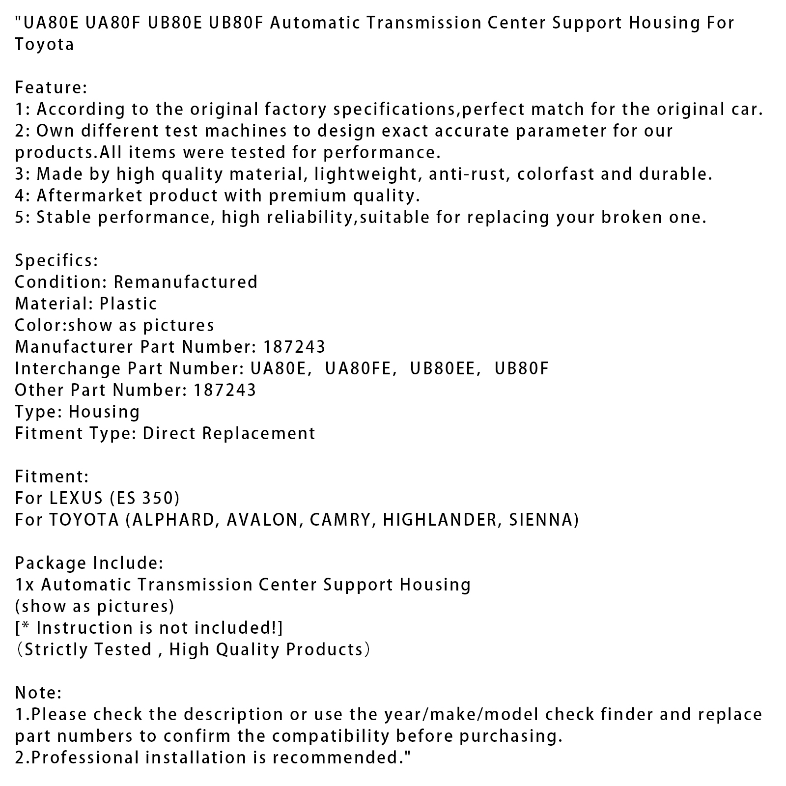 -  -  -  -  -  -  -  -  -  -  -  -  -  -  -  -  -  -  -  -  Product Description Please kindly note: This item is **Refurbished Parts**, not Brand New. To ensure compatibility, we recommend providing your ①VIN, ②OE Number, ③The clear photo of your original part if possible. Auto parts are highly complex, and this information helps us confirm the correct fit. Thank you so much! UA80E UA80F UB80E UB80F Automatic Transmission Center Support Housing For Toyota Feature: 1: According to the original factory specifications,perfect match for the original car. 2: Own different test machines to design exact accurate parameter for our products.All items were tested for performance. 3: Made by high quality material, lightweight, anti-rust, colorfast and durable. 4: Aftermarket product with premium quality. 5: Stable performance, high reliability,suitable for replacing your broken one. Specifics: Condition: Remanufactured Material: Plastic Color:show as pictures Manufacturer Part Number: 187243 Interchange Part Number: UA80E,UA80FE,UB80EE,UB80F Other Part Number: 187243 Type: Housing Fitment Type: Direct Replacement Fitment: For LEXUS (ES 350) For TOYOTA (ALPHARD, AVALON, CAMRY, HIGHLANDER, SIENNA) Package Include: 1x Automatic Transmission Center Support Housing (show as pictures) \[\\* Instruction is not included!\] (Strictly Tested , High Quality Products) Note: 1.Please check the description or use the year/make/model check finder and replace part numbers to confirm the compatibility before purchasing. 2.Professional installation is recommended. - SHIPPING&RETURNS - WARRANTY - ABOUT US ♦Please note that your item will typically be dispatched **within 5 business days** after payment confirmation. We have **multiple warehouses** across the United States, so the parcel will be shipped from the warehouse with the available stock, **not only from our LA/Chino location**. ♦Delivery usually takes **5-12 business days**, depending on your delivery address and any potential shipping delays due to unforeseen circumstances. ♦ **If for any reason, you are not satisfied with your purchase and would like to initiate a return, please contact us first. We will provide you with the return instructions to ensure the process is as smooth and cost-effective as possible.** ♦We strive to offer the best service and aim to save you both time and money. Thank you for choosing us! ♦ **60 Day Money Back Guarantee** ♦The warranty does not extend to normal wear and tear of products; products damaged due to environmental conditions including rain, snow, hail, salt, or natural disasters; products damaged due to accident or collision; or product damage caused by other faulty parts. ♦All items must be in their original condition and must not be damaged due to incorrect installation upon return. Products damaged as a result of abuse, misuse, improper repairs or maintenance, improper installation, alteration, or modification will not be covered by the warranty. ♦We need buyer's detailed description of failure to find out the cause, we may also ask for photos or videos, pls understand. ♦Under NO circumstances will our liability exceed the amount of the original sale. ♦We must be notified of the intent to return your item within **30 days** of receiving the item. ♦EACH WARRANTY DOES NOT COVER ANY LABOR COSTS OR INCIDENTAL, INDIRECT, SPECIAL OR CONSEQUENTIAL DAMAGES SUCH AS, BUT NOT LIMITED TO, PHYSICAL INJURIES OR PROPERTY DAMAGE, LOSS OF TIME, LOSS OF USE OF THE VEHICLE, INCONVENIENCE, AIR FREIGHT CHARGES, RENTAL VEHICLE CHARGES, TOWING CHARGES OR ACCOMMODATIONS RESULTING FROM A DEFECT IN OR FAILURE OF THE PART. **MadHornets** has given our customers the best Auto parts, Motorcycle parts available on the market. We do it all, from motorcycle, cars and trucks to SUVs and more. Basically, if it’s on wheels and you need it, we can handle it. With our extensive knowledge and experience in this industry, we continue to bring you the best auto, motorcycle parts. We have more than 20,000 square meters of self-owned or third-party warehousing and logistics bases in the United States, the United Kingdom, Australia and other countries, and have a complete supply chain system to deliver high-quality products from all over the world to consumers. We are also committed to the development of Electronics, Home Garden, Stage Lights and other categories. MadHornets continues to bring you superior quality and cost effective products. We always stand behind our products by our Money Back Guarantee and Manufacturer Warranty. Don't hesitate, add this store to you favorites SHIPPING&RETURNS ♦Please note that your item will typically be dispatched **within 5 business days** after payment confirmation. We have **multiple warehouses** across the United States, so the parcel will be shipped from the warehouse with the available stock, **not only from our LA/Chino location**. ♦Delivery usually takes **5-12 business days**, depending on your delivery address and any potential shipping delays due to unforeseen circumstances. ♦ **If for any reason, you are not satisfied with your purchase and would like to initiate a return, please contact us first. We will provide you with the return instructions to ensure the process is as smooth and cost-effective as possible.** ♦We strive to offer the best service and aim to save you both time and money. Thank you for choosing us! WARRANTY ♦ **60 Day Money Back Guarantee** ♦The warranty does not extend to normal wear and tear of products; products damaged due to environmental conditions including rain, snow, hail, salt, or natural disasters; products damaged due to accident or collision; or product damage caused by other faulty parts. ♦All items must be in their original condition and must not be damaged due to incorrect installation upon return. Products damaged as a result of abuse, misuse, improper repairs or maintenance, improper installation, alteration, or modification will n
