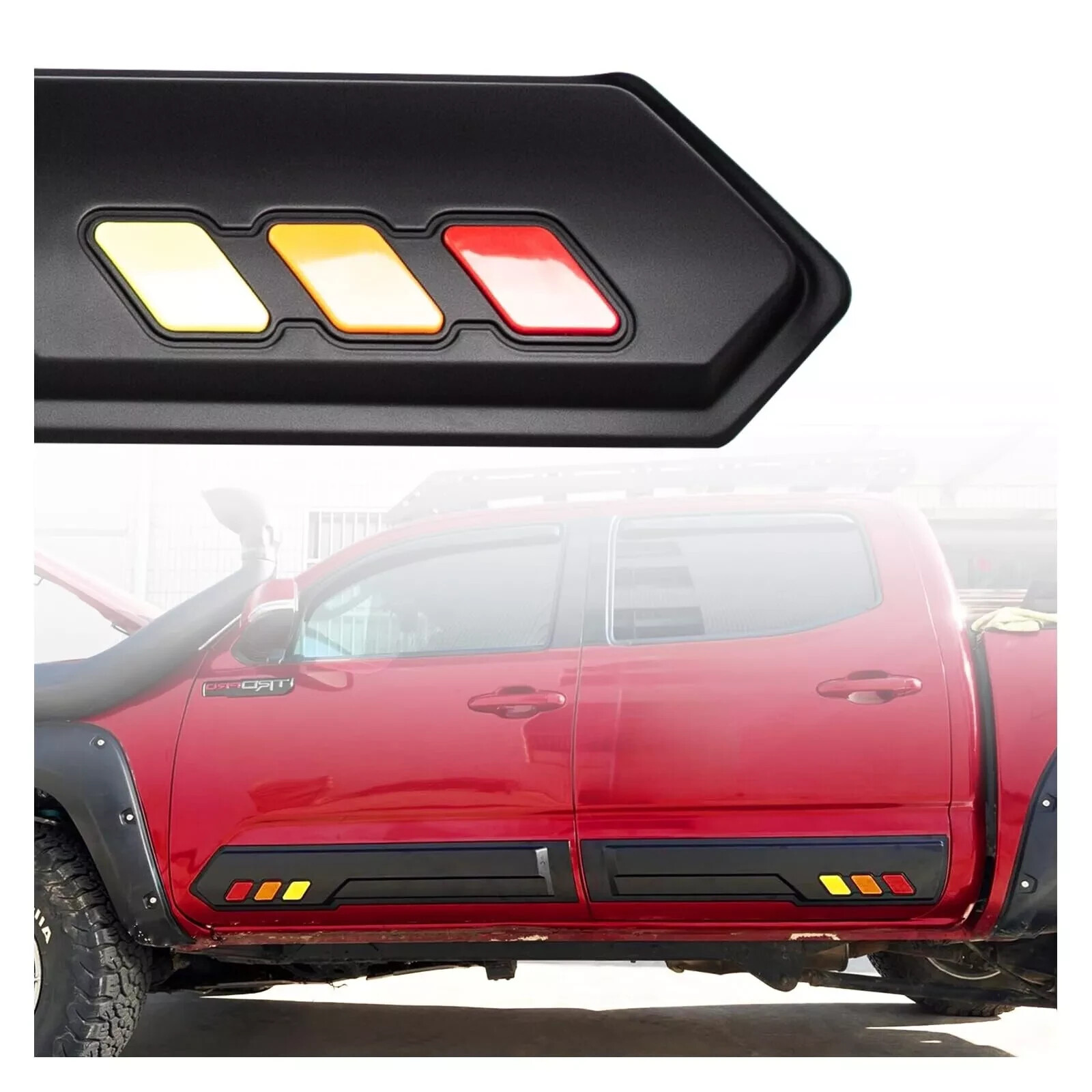 # About this item **This is a second-hand product with normal functions. If you have any questions, please contact us and we will provide after-sales service and return and refund services.** - Application:Door side guards compatible with 2016 2017 2018 2019 2020 2021 2022 2023 Tacoma models. - High-Quality Material: Matte black high-quality coating, scratch-resistant and durable, lightweight and sturdy. - Additional Protection: Door guards provide extra protection from road debris, mud and gravel hitting your Tacoma. - Easy Installation: These door rocker Panels are designed for simple peel-and-stick installation with automotive-grade adhesive.Package comes with 3M glue. - Warranty: These rocker panels come with a 1 year limited warranty, please feel free to contact us with any questions.  Application:Door side guards compatible with 2016 2017 2018 2019 2020 2021 2022 2023 Tacoma models. Enhance style and functionality. Protect your vehicle's rocker panels from the damaging effects of various thrown debris by installing these door rocker panels. Additionally, the matte black finish and tri-color badging enhance your truck's unique style. High-quality materials. These rocker panels are constructed from high-strength, flexible, high-impact materials for long-lasting durability. It also precisely fits the contours of your truck and looks great once installed. Easy Installation with 3M Automotive Grade Adhesive Package comes with 3M glue Sold As: 4 Piece Kit Provides Extra Protection from Scratches, Dents, and Chips Matt black coating Red orange yellow color logo