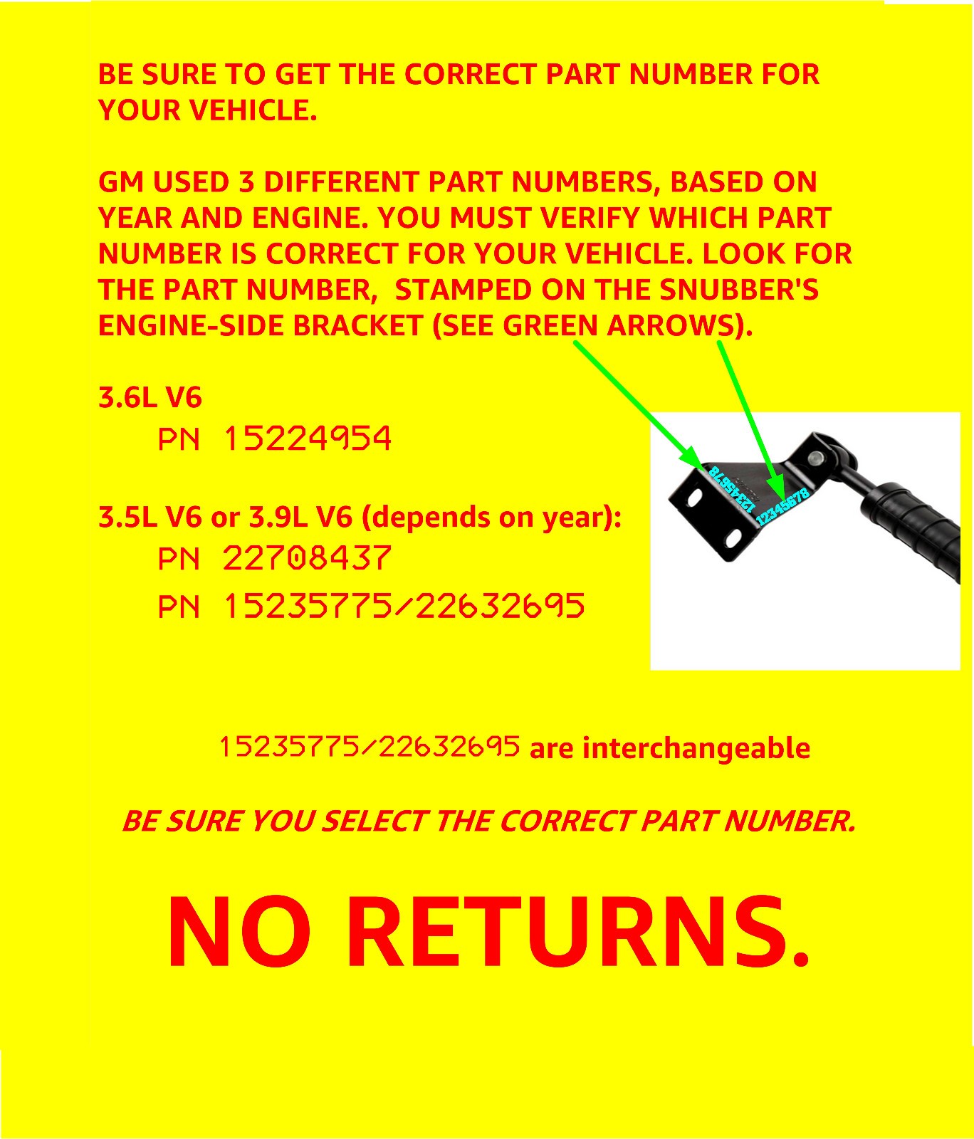 Information is contained in the photos. Please examine every photo. Therefore, it is a used part and will be in different stages of use. That's why I am telling you right here: **If your snubber is not broken, you probably don't need to replace it.** **>> If your feel your snubber is "loose", the one I sell to you may be more loose. Remember: my part is a used part just like yours.** Please view all the photos for information and warnings. Photos are provided for reference, you will receive parts with the correct part numbers indicated in the photos; photos do not indicate the actual part being sent. This part is no longer available from GM since 2020. If your snubber bracket has part **22708437** stamped, then this snubber is the correct part. You are urged to apply a little grease on the bolt threads to avoid the possibility of thread seizure or thread stripping. Do not use impact tools. You may damage the mounting. If available, a spare bolt will be included in case you drop one and can't find it. No attempt to clean the part was made, the part will be shipped in the condition in which it was removed. The snubber part is not hydraulic nor is it spring loaded. Expanding and contracting the snubber by hand can be expected. As long as your snubber is not physically broken, your existing snubber is probably OK and won't need to be changed. See photo. The item you will receive can be elongated and compressed by hand. It is your responsibility to verify part numbers. Shipping discount applies if you purchase more than one. To minimize delay and loss, your package is personally delivered to and handed to a post office clerk. USPS rates increased once again in 01-Oct-2025.