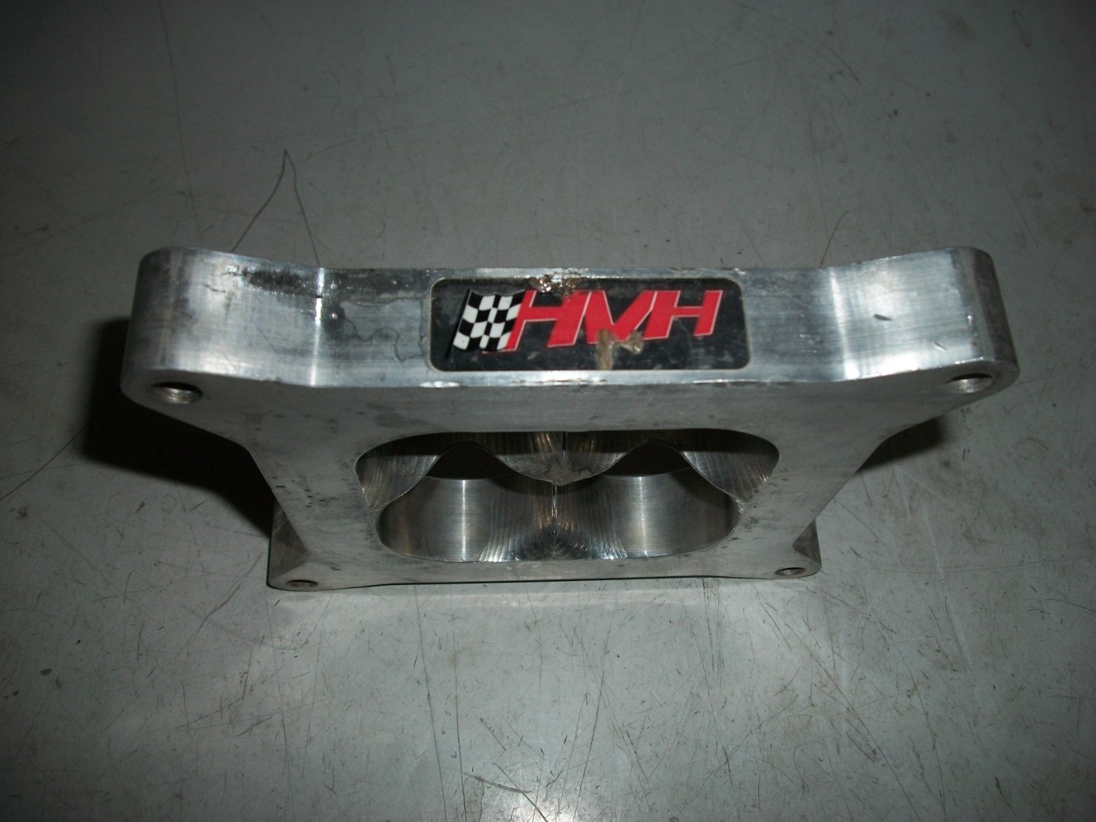 The product is a USED HVH carburetor spacer made of aluminum, with a tapered design and a thickness of 1 inch. Manufactured in the USA, this performance part is designed for carburetors such as 650 750 and 850 fits all 4150 style carbs, and is intended to enhance air and fuel delivery in cars and trucks. The spacer provides a solid and durable component for improving the performance of the vehicle's carburetor system. --------------------------- FREE SHIPPING ---------------------------------
