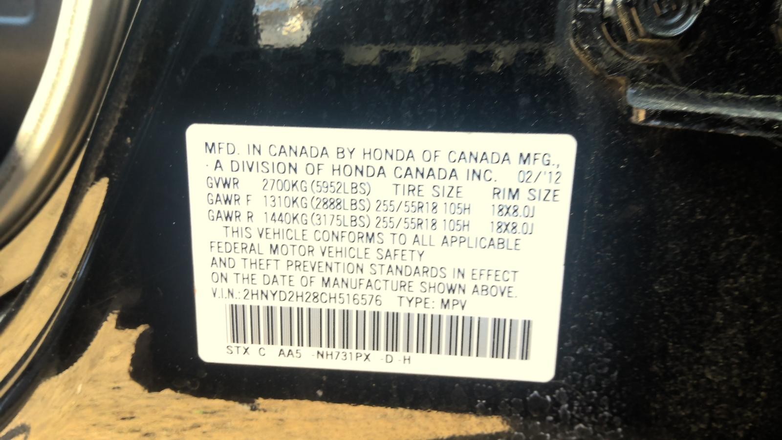- VIN: 2HNYD2H28CH516576