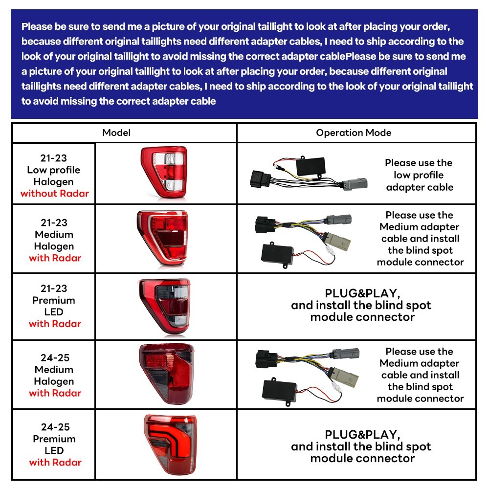 **Pair Red Full LED Tail Lights Fit For Ford F150 2021-2025 Rear Lamps Assembly** **1.You can remove the back-up radar from your original taillights and install it on the back of our taillights!!!** **Features:** 1\. One pair: Left + Right tail lights 2. Tail Light Lens: Smoked Lens, Chrome Housing 3. Bulbs: All bulbs are built-in LED, no extra bulbs needed 4\. Function: Rear Running Light (Red)+Turn Signal(Red)+Reverse(White)+Brake (Red) lights 5\. Easy installation: plug and play,same as original one to install 6.Assembly: all parts are included in the package,no need to buy extra bulbs or harness **Fitment** **Fits For** **Ford F150 F-150 2021-2025** **( Professional Installation is Highly Recommended )** **Package include** **1 Pair of Taillights (driver's side + passenger's side)** **Note** 1\. Please confirm whether this car-lamps can fit your car before buying, if you are not sure, please contact us and send us pictures of your original car light or plug. 2\. Using your factory supplied connector/harness will avoid cutting or modifying any wires. **Specification** ·90% Brand New ·Professional Installation is Highly Recommended ·Welcome to send us message for more information **Warranty:** One-Year warranty after receiving **After Sales Service** Please contact us before returning the products, we will do our best to help you solve all the problem well with good service!!! **Questions** Any question will be replied within 24 hours except the weekend and holiday. We will serve for you all sincerity!